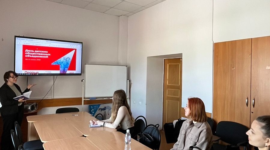 18 мая 2023 года на 3 курсе направления подготовки «Педагогическое образование», профиль «Иностранный (английский) и немецкий язык» в рамках проекта «Разговоры о важном» прошел кураторский час на тему «День детских общественных объединений». Цель занятия: сформировать у обучающихся представления о детских общественных объединениях и вовлечь в деятельность Российского движения детей и молодежи «Движение первых», мотивировать на участие в проектах Движения и в работе первичных отделений. На занятии обучающиеся познакомились с Российском движением детей и молодежи «Движение первых», миссией и ценностями Движения. (докладчик Колесникова А.). Обсудили значимость поддержки и дружбы, командной работы: просмотрели видеоролик «Дружба»; обсудили деятельность отделения Движения в образовательной организации. Сделали вывод о том, что сегодня в России есть масса возможностей проявить себя, развить таланты и реализовать свои мечты, чтобы быть вовлеченным в самые разные отрасли и сферы жизни нашей страны. Все эти проекты – большой и мощный инструмент, который поможет реализовать самые амбициозные идеи.