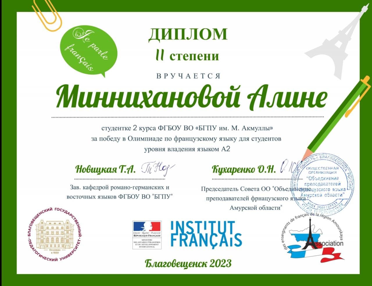 С 29 мая по 6 июня 2023 г. проходила Олимпиада по французскому языку среди студентов российских вузов, изучающих язык Мольера и Превера на уровне А2 по общеевропейской шкале. Организатором мероприятия выступила  ФГБОУ   ВО «Благовещенский государственный педагогический университет».
