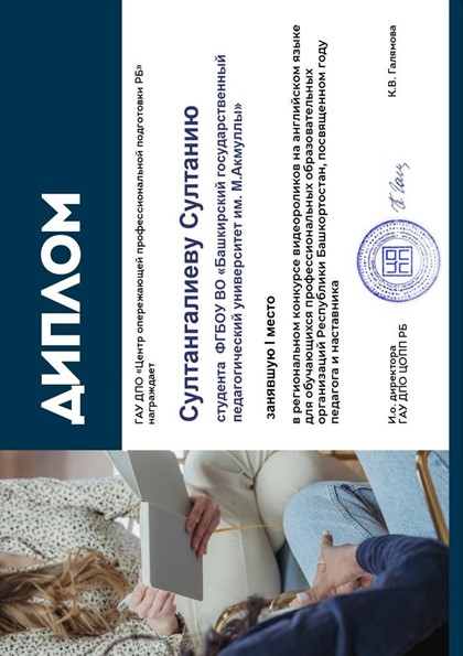 Студентка 3 курса направления подготовки Педагогическое образование, профиль Английский язык и русский язык как иностранный Султангалиева Султания стала победителем регионального конкурса видеороликов на английском языке, посвященного Году педагога и наставника (руководители: Х.Х. Галимова, С.А. Абдюшева).