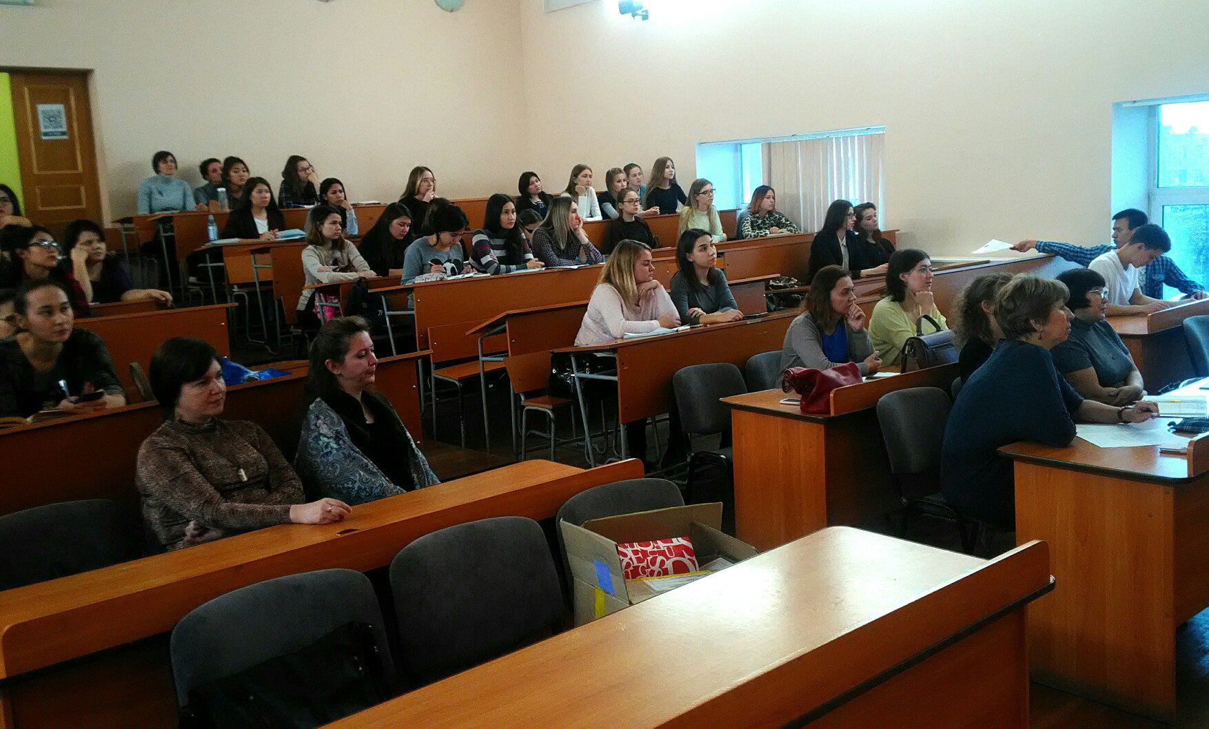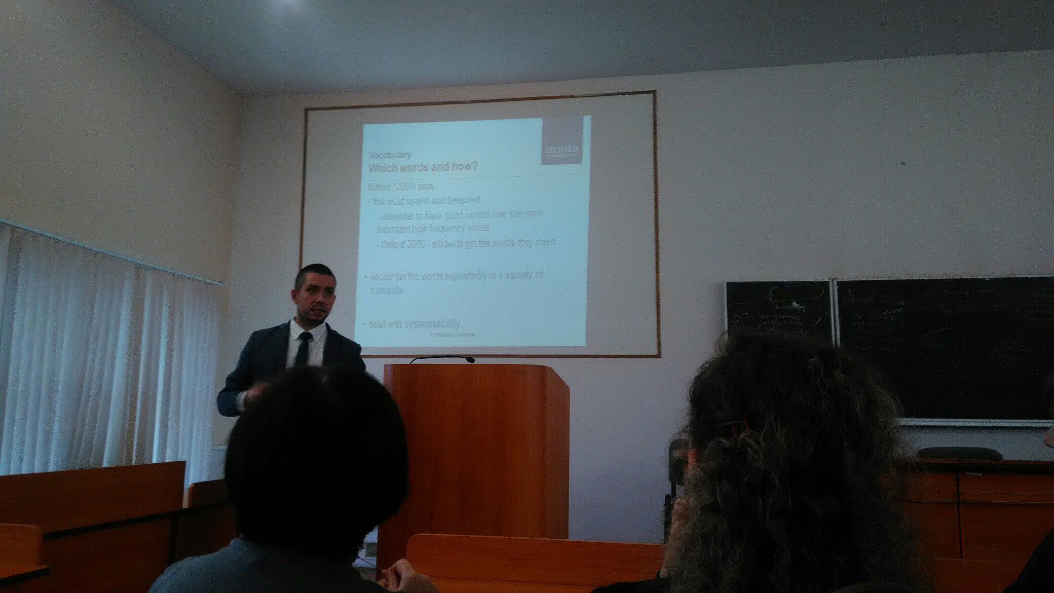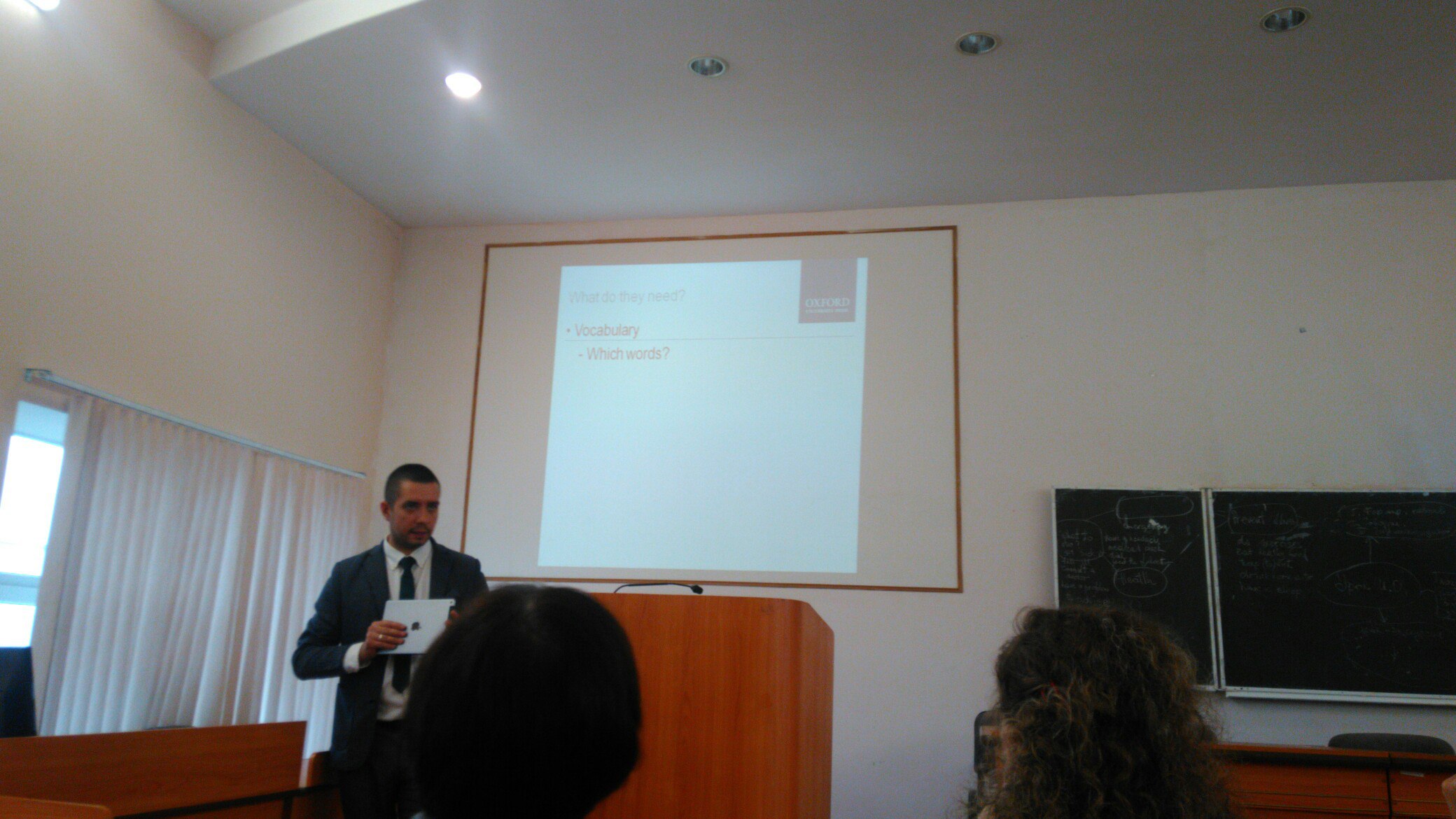 Темой встречи стало обучение английскому языку взрослых – «Targeted learning in Navigate». В ходе семинара обсуждались такие актуальные вопросы , как особенности, характерные для взрослых студентов, правильная постановка цели для каждого обучающегося и построение соответствующей ей образовательной траектории, мотивация, проблемы, возникающие при обучении навыкам аудирования, говорения, чтения, письма и способы их решения. Для иллюстрации были продемонстрированы фрагменты уроков, которые наглядно показали способы решения этих образовательных задач на практике. Семинар получился очень содержательным и полезным, как для преподавателей, так и для студентов, которые получили дополнительные знания о методике преподавания английского языка непосредственно из уст представителя британского издательства.