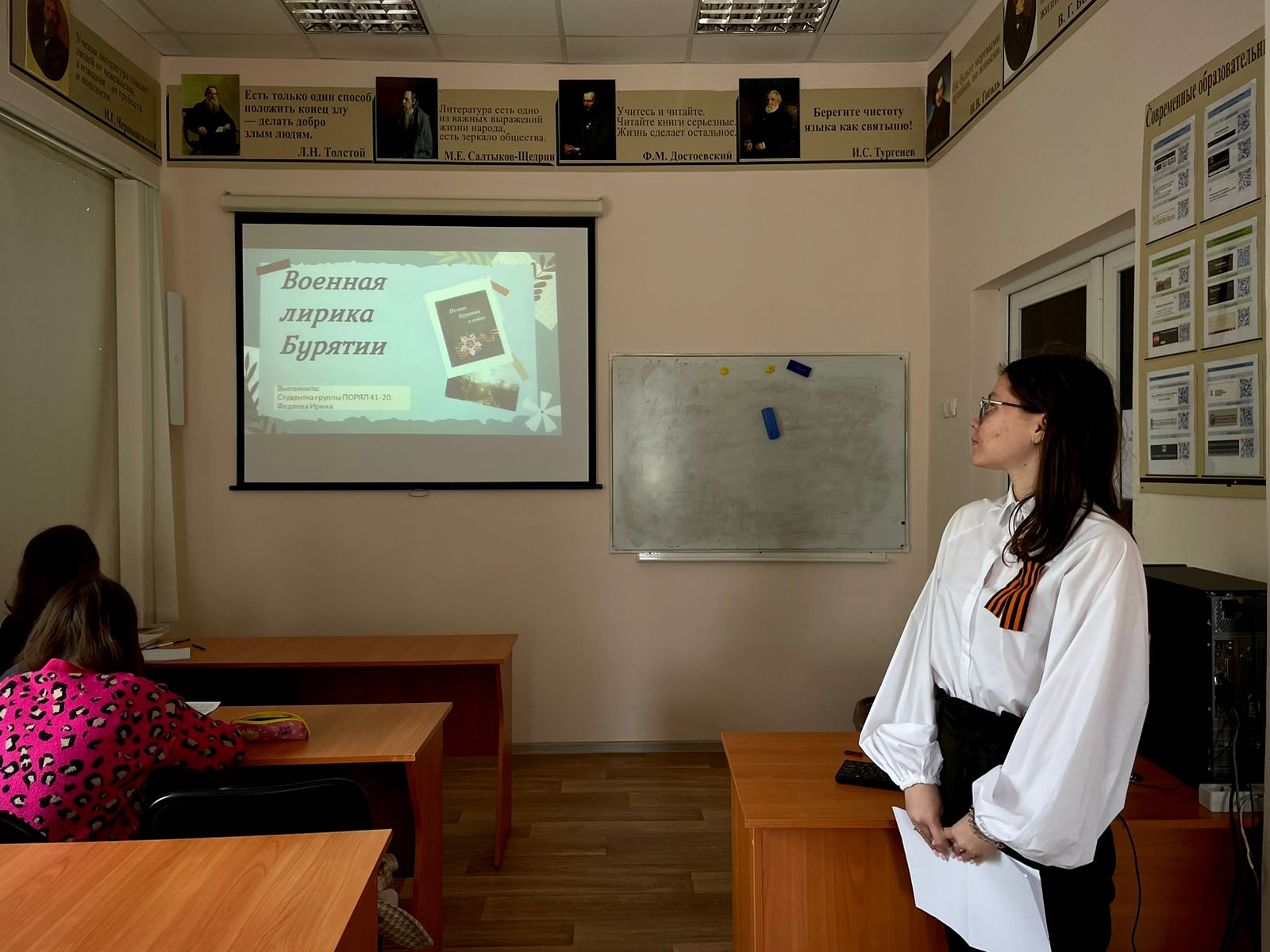8 мая 2024 г. в ИФОМК состоялись Поэтические чтения «День Победы в поэзии народов России». К этому мероприятию студенты 4 курса направления подготовки «Педагогическое образование» профиля «Русский язык и литература» под руководством ассистента кафедры русской литературы Екатерины Салимбаевой подготовили выразительное чтение стихотворений и сообщения о творчестве поэтов, представляющих разные культуры народов России и посвящавших произведения теме Великой Отечественной войны и Победы. Свои выступления участники чтений сопроводили презентациями. Прозвучали стихотворения дагестанских авторов Расула Гамзатова, Фазу Алиевой, Юсупа Хаппаева; бурятских поэтов Алексея Уланова, Данри Хилтухина, Цокто Номтоева, Дамба Зодбича Жалсараева; татарского поэта Мусы Джалиля; башкирских лириков Ханифа Карима, Саляха Кулибая, Малиха Хариса, Назара Наджми, Гилемдара Рамазанова, Мустая Карима, Рашита Нигмати и Мухаметши Бурангулова.
