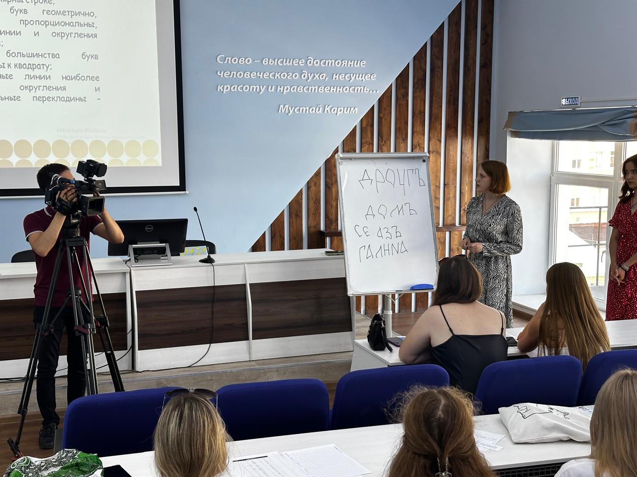 БГПУ им.М.Акмуллы в данном проекте представляет Международный  центр изучения и продвижения русского языка имени М. Карима. Профессор Гульнара Кудинова рассказала ребятам о современных филологических исследованиях, роли филологов в глобальном образовательном пространстве, а студенты 3 курса профиля «Русский язык и литература» Галина Калаганова и Аделина Сагадеева провели для школьников  мастер-класс по каллиграфии на старославянском языке.  Гости написали чернильными перьевыми ручками свои имена и фамилии старославянским шрифтом, а победитель конкурса получила приз.