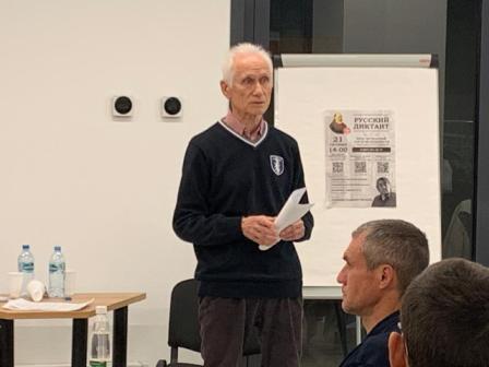 Текст диктанта на одной из площадок читал И.В. Артюшков. В написании диктанта и затем в его проверке активное участие приняли 18 студентов 5 курса ПО РЯЛ ИФОМК, за что им огромное спасибо. В преддверии педагогической практики это стало серьезной проверкой их готовности к профессиональной работе. Со своей задачей они в целом справились и показали хорошие результаты, а пятеро из них стали отличниками (всего в этом было 10 отличников). Отличники были награждены дипломами и книгой А.А. Проханова.