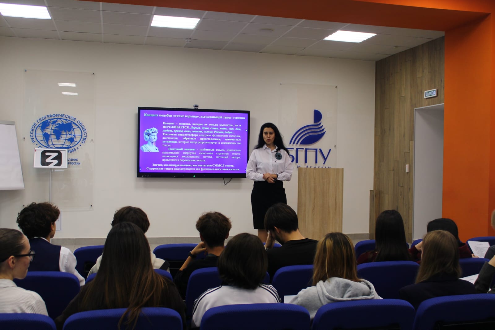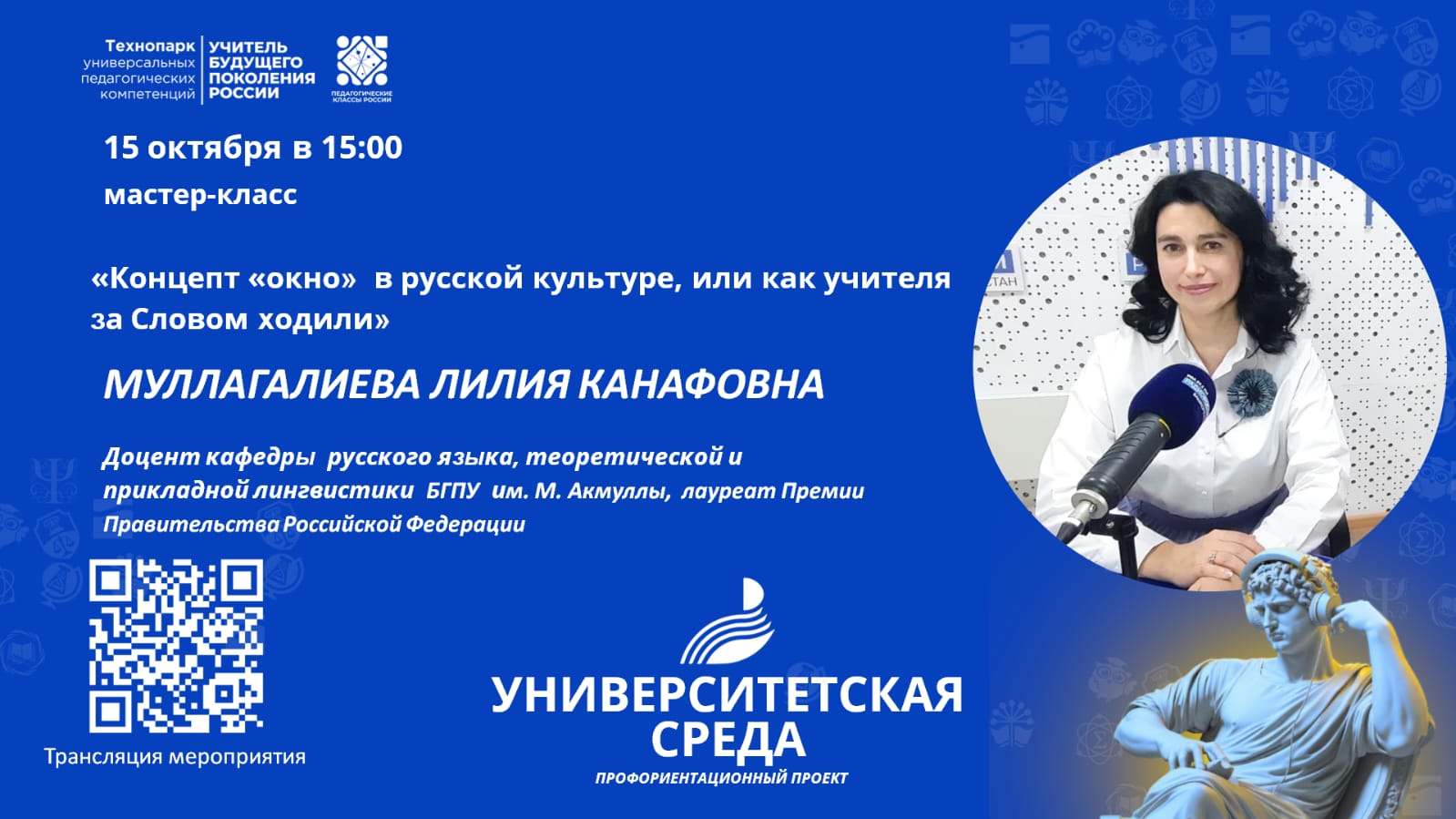 15 октября 2025 года в Лектории Технопарка Акмуллинского университета доцент кафедры русского языка, теоретической и прикладной лингвистики, лауреат Премии Правительства РФ Лилия Канафовна Муллагалиева в рамках профориентационного проекта «Университетская среда»  провела мастер-класс для учителей и обучающихся уфимских школ.