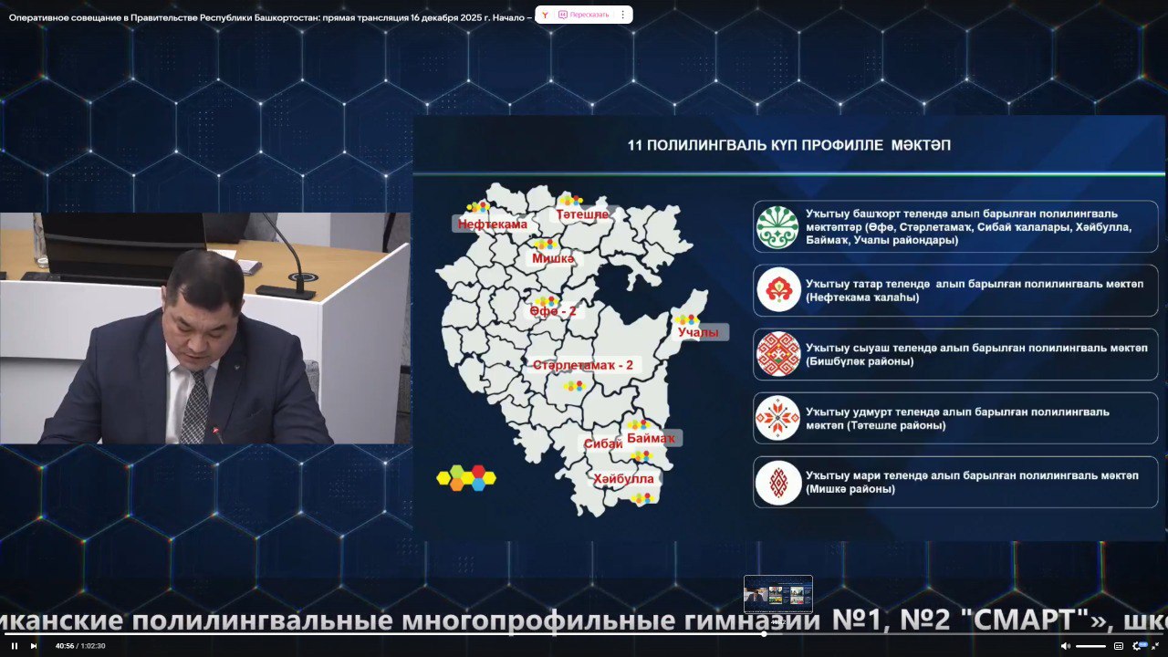 Напомним, на сегодняшний день только в региональную сеть полилингвальных школ входят 11 передовых образовательных учреждений, географически расположенных в разных городах и районах республики. Учатся там 11 тысяч детей, обучение ведется в том числе на башкирском, татарском, чувашском, удмуртском, марийском языках. В Уфе и селе Стерлибашево работают полилингвальные детские сады. До 2030 года в республике планируется открыть еще 5 полилингвальных школ.