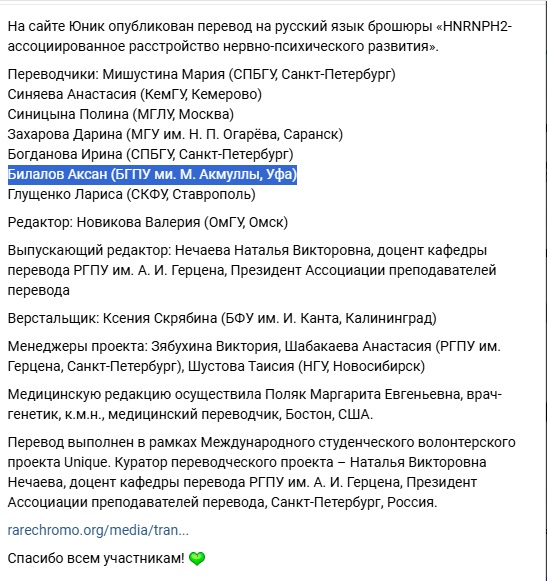 Опубликован результат волонтерской работы участников Международного волонтерского студенческого переводческого проекта Unique - перевод на русский язык брошюры «HNRNPH2-ассоциированное расстройство нервно-психического развития».