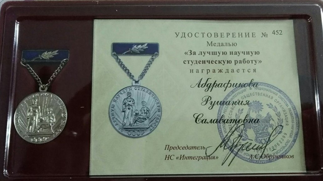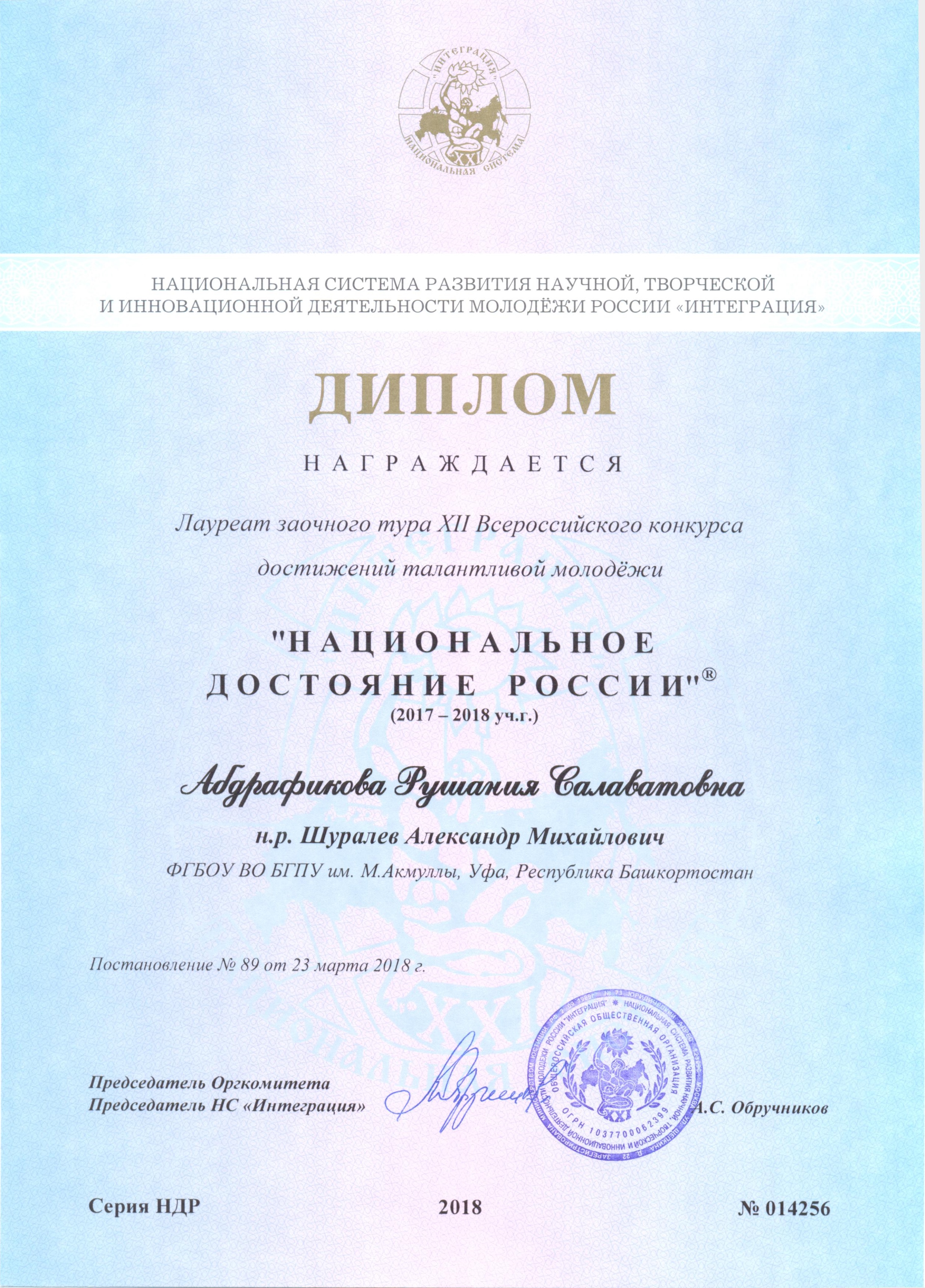 Студентка 3 курса ИФОМК (профиль «Русский язык и литература», ОЗО) Рушания Абдрафикова под научным руководством профессора кафедры русской литературы А.М. Шуралёва стала победителем Всероссийского конкурса достижений талантливой молодёжи «Национальное достояние России». Став лауреатом заочного этапа конкурса, Рушания приняла участие в финальной очной конференции, которая состоялась в д/о «Непецино» Управления делами Президента Российской Федерации (Московская область, Коломенский район). По итогам финала Р. Абдрафикова стала лауреатом I степени и награждена медалью «За лучшую научную студенческую работу».  На конкурс была представлена научно-исследовательская работа «Изображение природы в творчестве К.Ф. Зиганшина: нравственно-эстетический и методический аспекты», включающая научное исследование творчества известного уфимского писателя-путешественника и электронное учебное пособие по изучению его биографии и произведений в школе. Также лауреатом заочного этапа конкурса стала студентка 4 курса Эльза Кусякова с исследовательской работой «Формирование универсальных учебных действий обучающихся при изучении творчества А.П. Платонова».