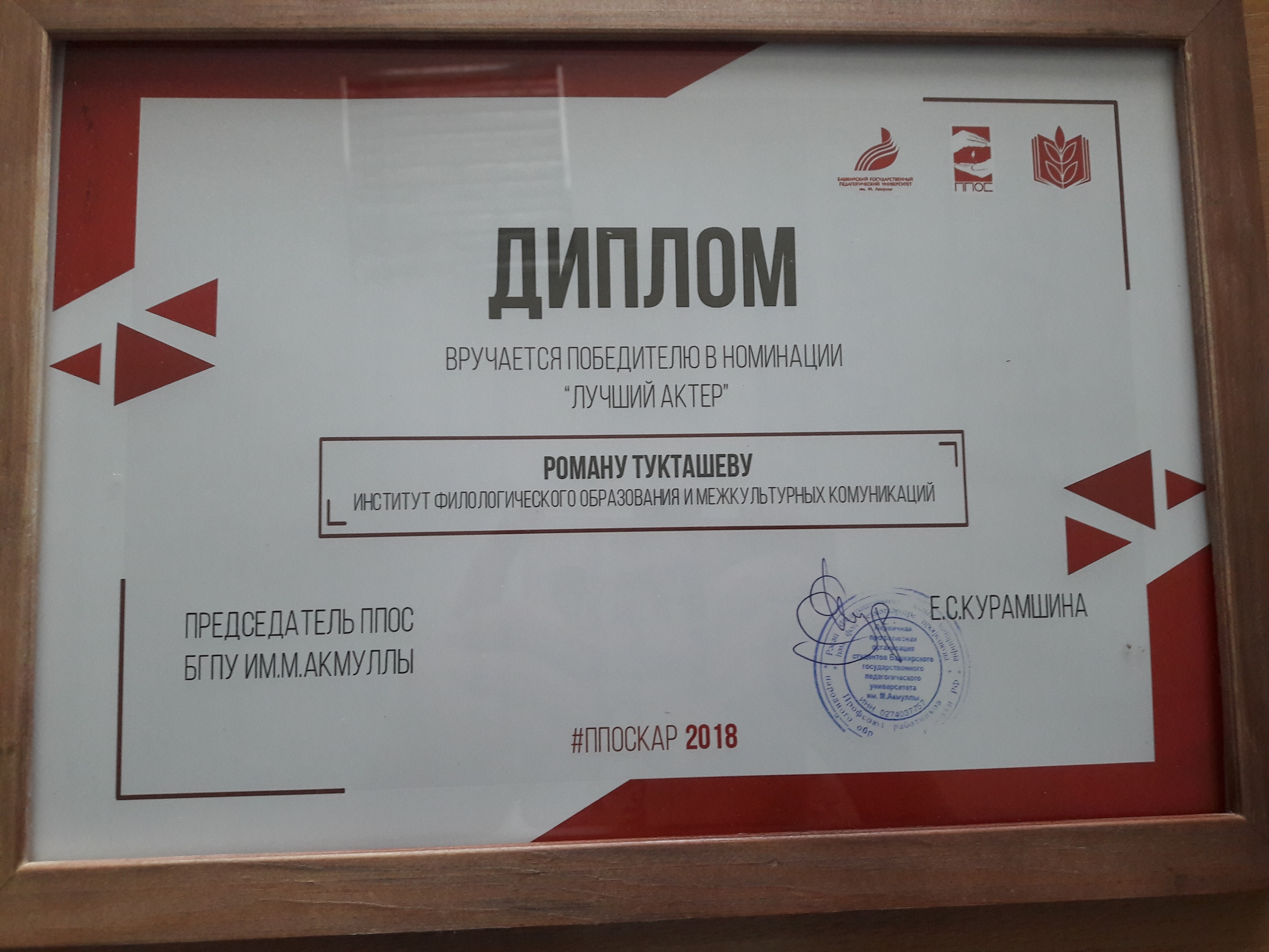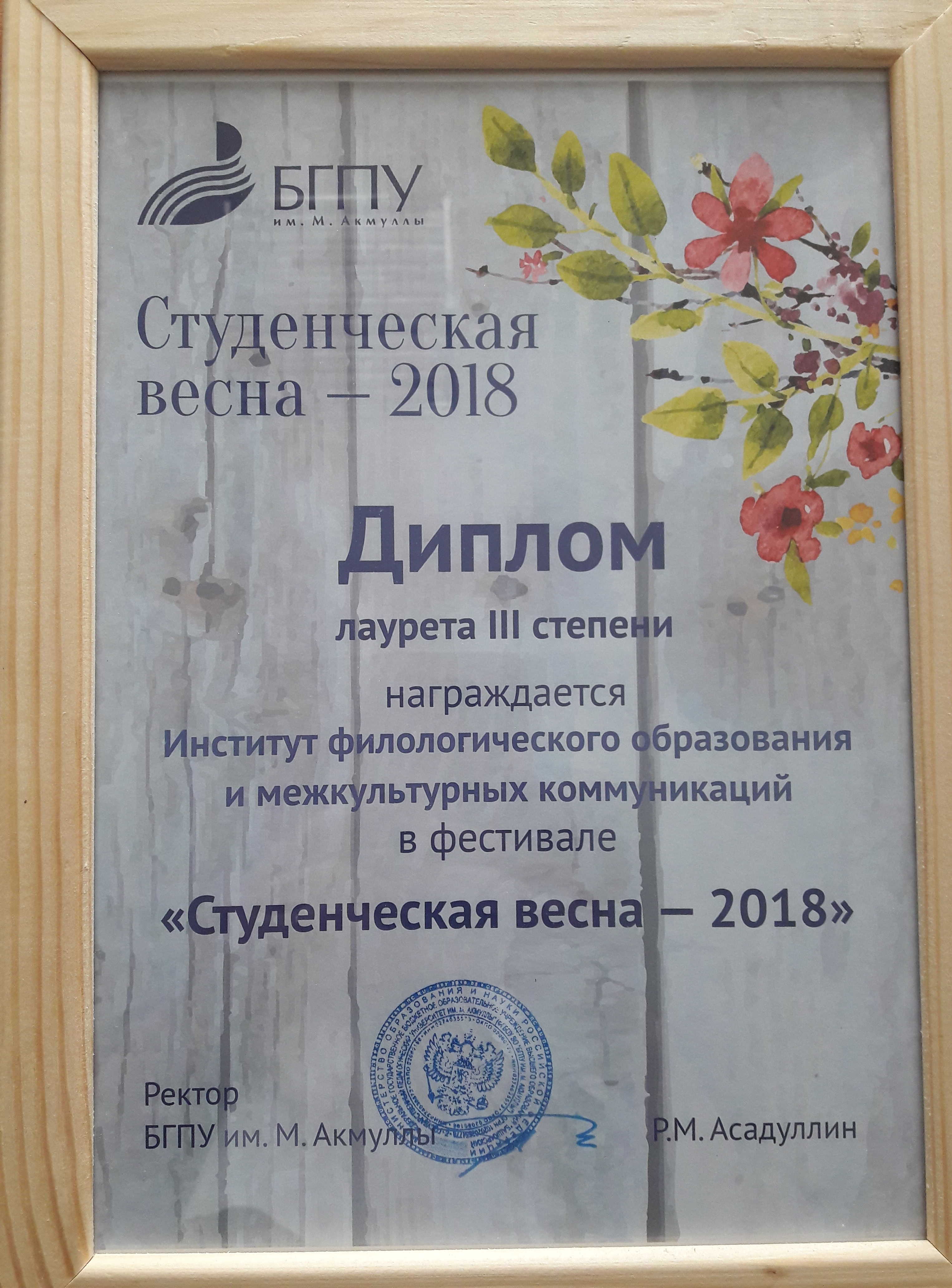 Ректор университета Р.М.Асадуллин вручил дипломы «За содействие в развитии студенческого творчества» директору ИФОМК Х.Х.Галимовой, зам. директора по СиВР И.И.Акопян. Роман Тукташев  стал  победителем  в номинации «Лучший актер», Сабина Беркумбаева  награждена  дипломом лауреата 1 степени в номинации «Мажоретки». Дипломы  лауреатов 2 степени  вручены Ольге Валитовой в номинации «Художественное слово»,  Элеоноре Лукмановой в номинации «Вокал», Эльвире Мухаметшиной в номинации «Хореография», Элине Хакимовой в номинации «Современная хореография», награжденных Вокал», «Хореография», «Современная хореография». Дипломы лауреатов 3 степени вручены Маргарите Измайловой в номинации «Современная хореография», Яне Королевой в номинации «Хореография».  Выражаем огромную благодарность руководителю креативной группы Елизавете Васильевой