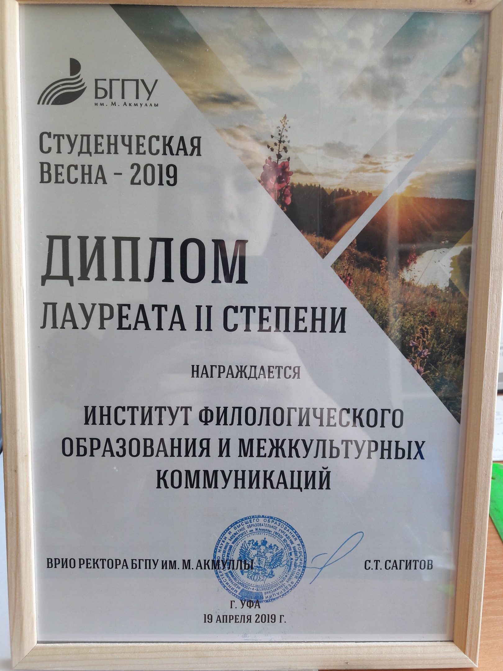 19 апреля 2019 года в ГКЗ «Башкортостан» состоялся гала-концерт «Студенческая весна – 2019» студентов БГПУ им. М. Акмуллы. В этом году мероприятие было посвящено 100-летию образования Республики Башкортостан, году театра. На сцене ГКЗ «Башкортостан» студенты представили хореографические постановки, музыкальные выступления, художественное слово. Студенты ИФОМК выступили под девизом «Смотри как красиво, ИФОМК – это сила» и показали, что мы все большая, дружная семья, а наша общая победа сплотила еще больше и сделала нас еще дружнее. Хотим поздравить студентов ИФОМК с почетным 2 местом! Врио ректора БГПУ им. М. Акмуллы С.Т. Сагитов объявил благодарность нашим студентам: Э.Хакимовой в номинации «Современная хореография», С. Аракелян в номинации «Вокально-инструментальное исполнение», О. Валитовой и Е. Игнатьевой в номинации «Художественное слово», Я. Королевой в номинации «Современная хореография», А. Ибрагимовой в номинации «Вокал», С. Беркумбаевой в номинации «Современная хореография». Спасибо всем за участие, желаем дальнейших творческих побед и успехов!