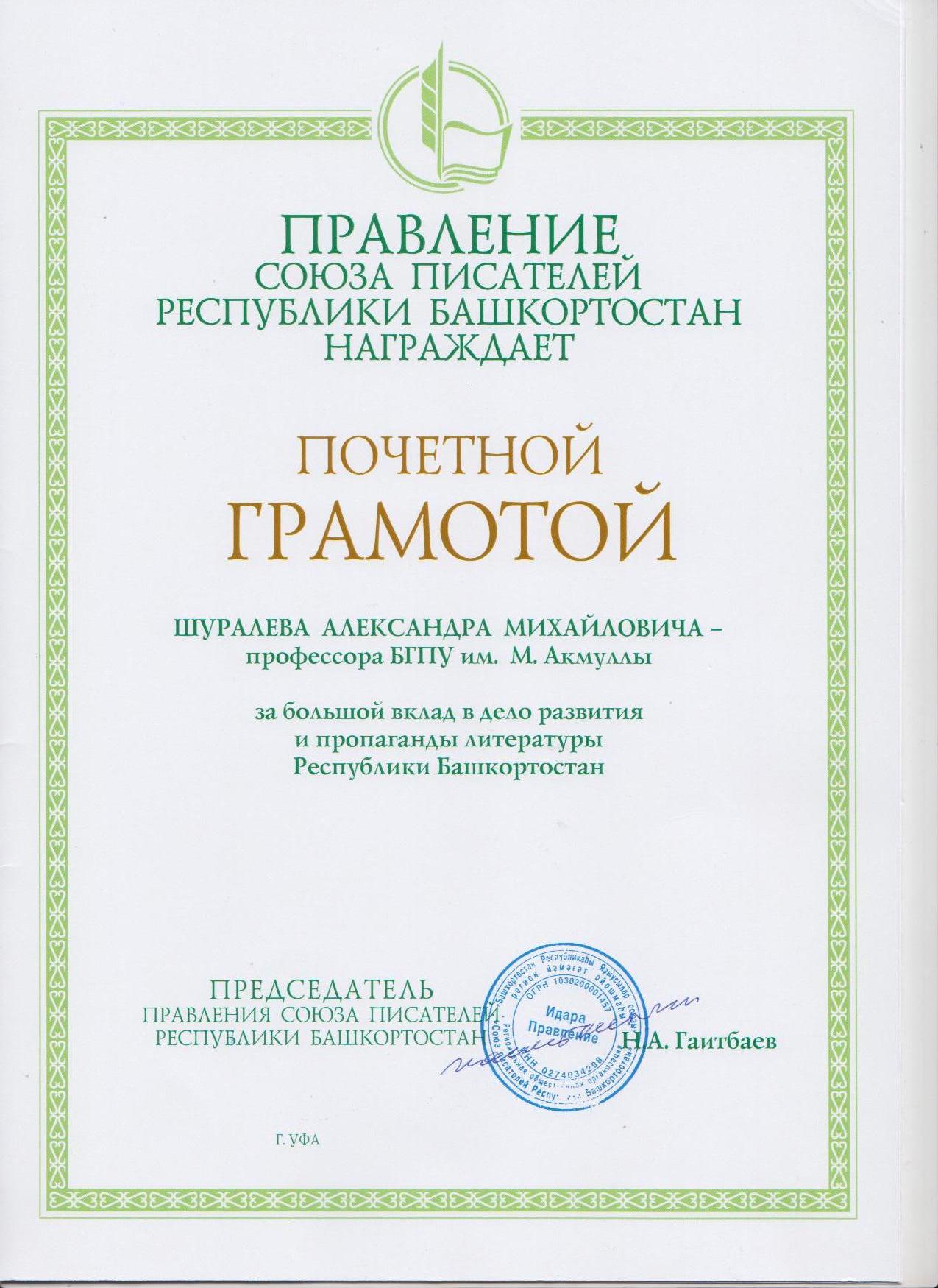 Профессор кафедры русской литературы награждён почётной грамотой Союза писателей РБ