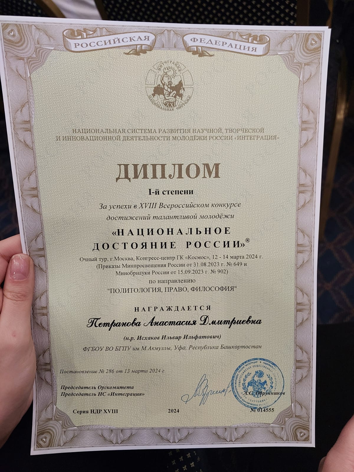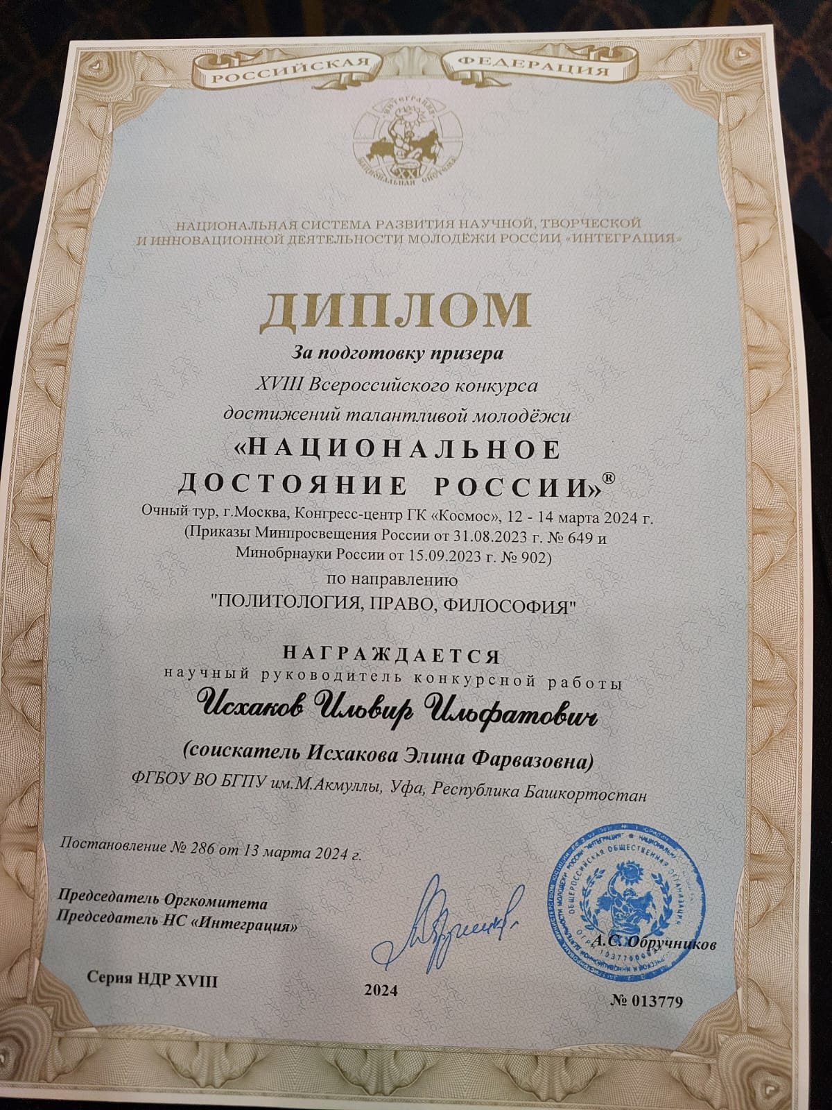 Конкурсная работа была подготовлена под руководством кандидата юридических наук, доцента кафедры обществознания, права и социального управления Акмуллинского университета Ильвира Исхакова.