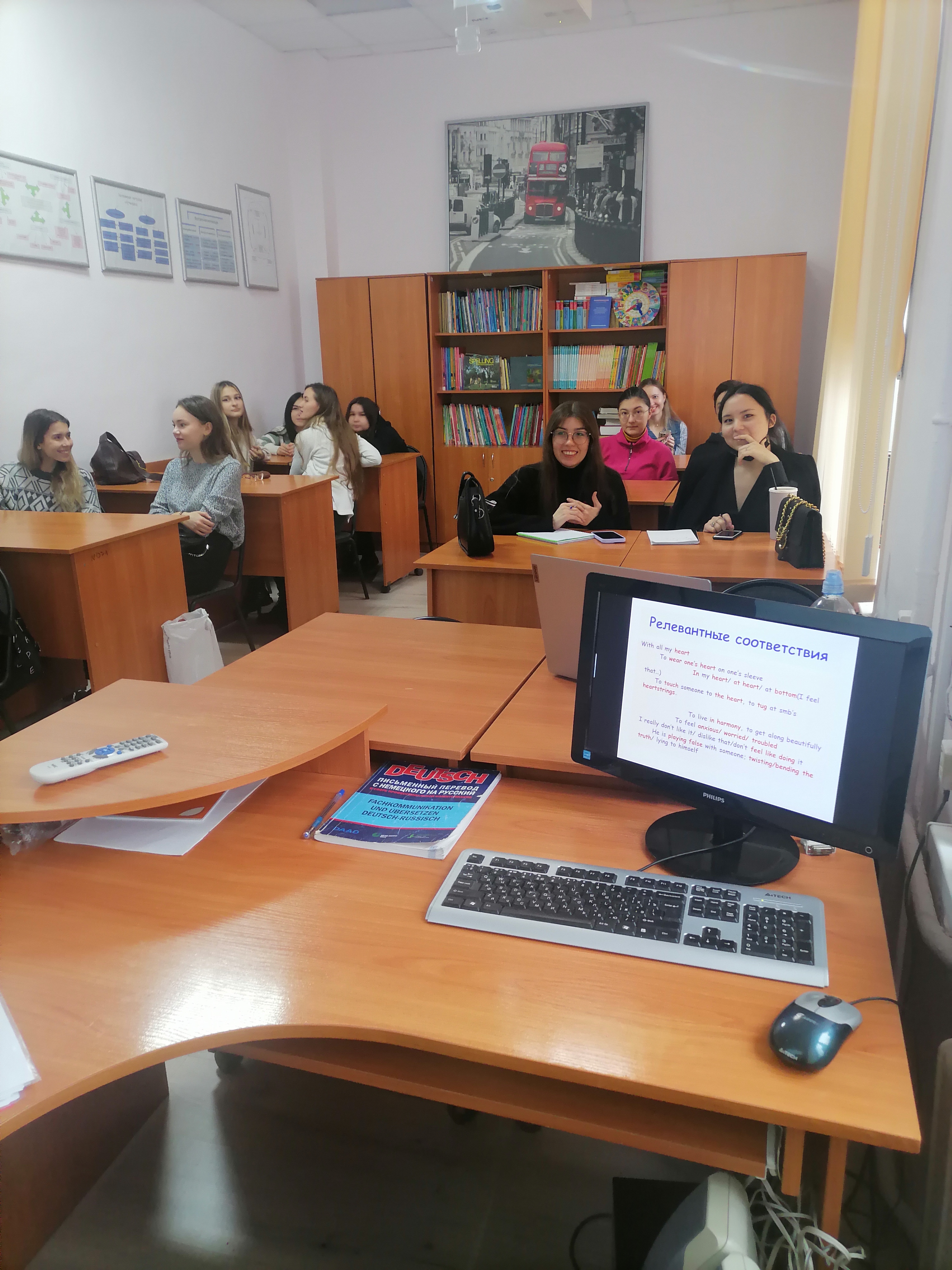 Студенты 4 курса кафедры межкультурной коммуникации и перевода в интерактивном формате обсудили проблему взаимоотношения языка и культуры на примере русской, английской и немецкой лингвокультур. Живой интерес у студенческой аудитории вызвал подробный анализ переводческих корреляций таких ключевых понятий русской культуры, как «душа», «тоска» и «судьба». Предложенные переводческие решения изучаемых лексем способствовали современному пониманию культуры будущими переводчиками, а именно особенностей исторических, социальных и психологических явлений, характерных для данного этноса.   В ходе лекционного занятия студенты научились не только переосмысливать каждое понятие, которое неэквивалентно английскому или немецкому языку, но и адекватно передавать колорит культурной жизни их носителей.