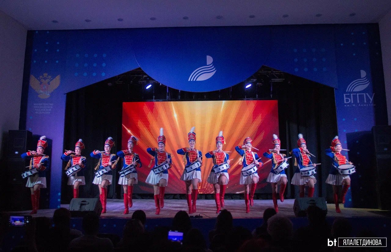 Участников торжественного мероприятия приветствовали заслуженный коллектив народного творчества Республики Башкортостан – группа  барабанщиц и мажореток «Держава» и студенческое танцевальное объединение «Движение».