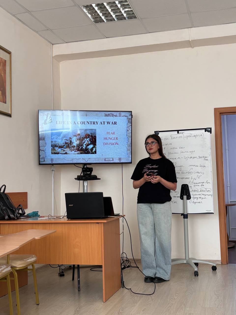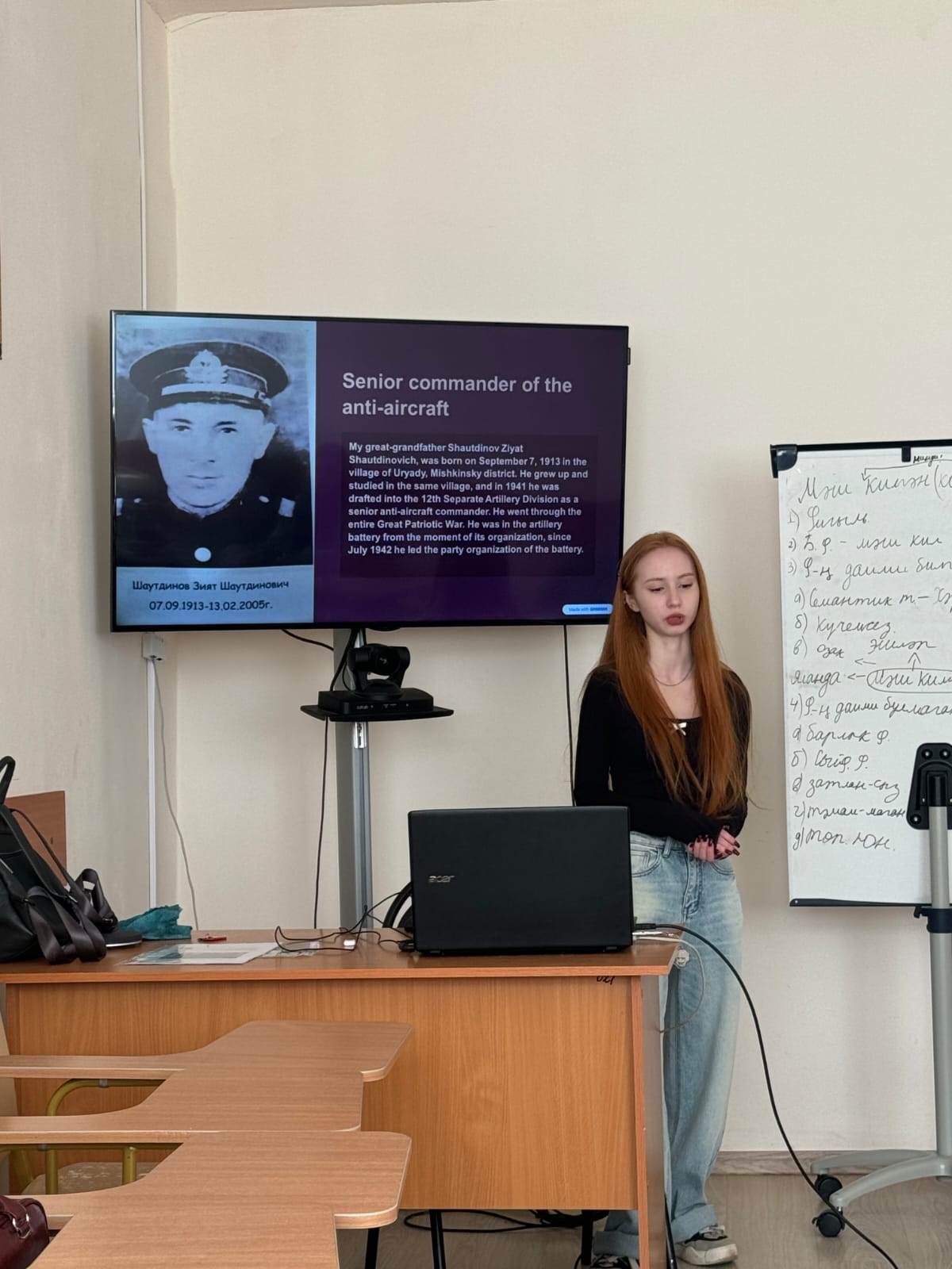 7 мая 2025 г. в группе ПОАЯ_ФЯ-11-24 прошло тематическое занятие, приуроченное к празднованию Дня Победы (организатор – доцент кафедры английского языка Римма Миндиахметова). Студенты выступали с  докладами о своих прадедах – участниках Великой Отечественной войны. В своих докладах студенты рассказали о том, как в семье бережно хранят и передают память о ветеранах, поделились историями из жизни нескольких поколений, подкрепляя выступления презентациями с фотографиями из семейного альбома. «Прадедушки уже нет в живых, но моя семья никогда не забудет о том, что они и миллионы других солдат, воевавших в годы Великой Отечественной войны, спасли весь мир от фашизма, чтобы мы могли жить под мирным небом. Сложно оценить общий вклад моих прадедов в победу в цифрах, но я знаю, что он огромен. Каждый из них внес свой вклад, независимо от масштаба. Победа советских войск – это настоящий подвиг, который совершили наши прадедушки, иногда ценой самопожертвования. Я ими горжусь!» – отметила Гульназ Алхайдарова.