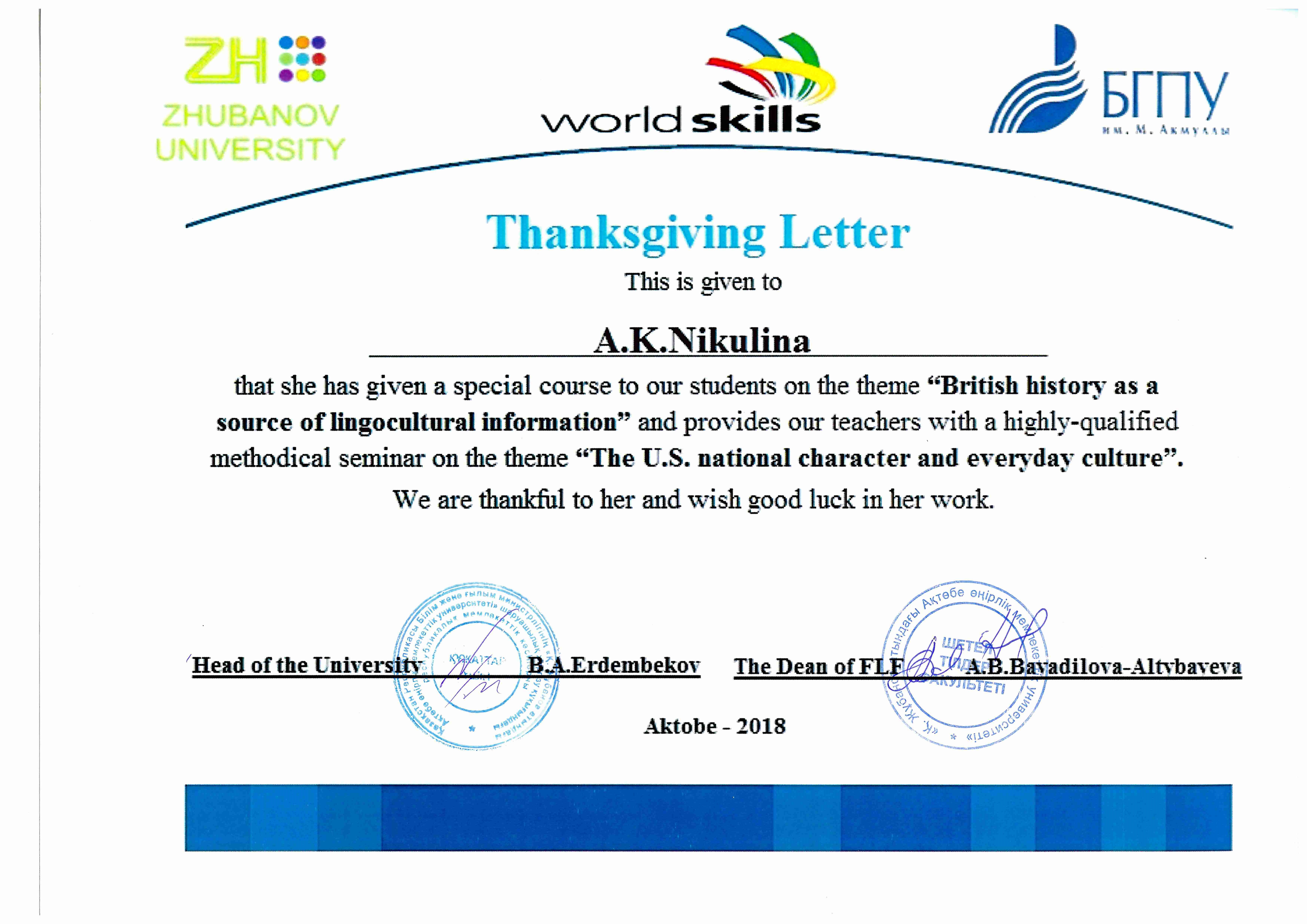 С 19 по 30 ноября 2018 г. доцент кафедры английского языка БГПУ им. М. Акмуллы  А.К. Никулина в рамках программы академической мобильности посетила Актюбинский региональный государственный университет им. К. Жубанова. В течение двух недель студенты казахстанского университета, обучающиеся по специальностям «Иностранная филология», «Переводческое дело» и «Иностранный язык: два иностранных языка», изучали разработанный А.К. Никулиной спецкурс «Британская история как источник лингвострановедческой информации». Спецкурс проводился на английском языке и дал возможность студентам не только глубже познакомиться с историей и культурой Великобритании, но и усвоить специфическую национально-маркированную лексику и приобрести лингвострановедческие фоновые знания, необходимые будущим специалистам в области иностранных языков.