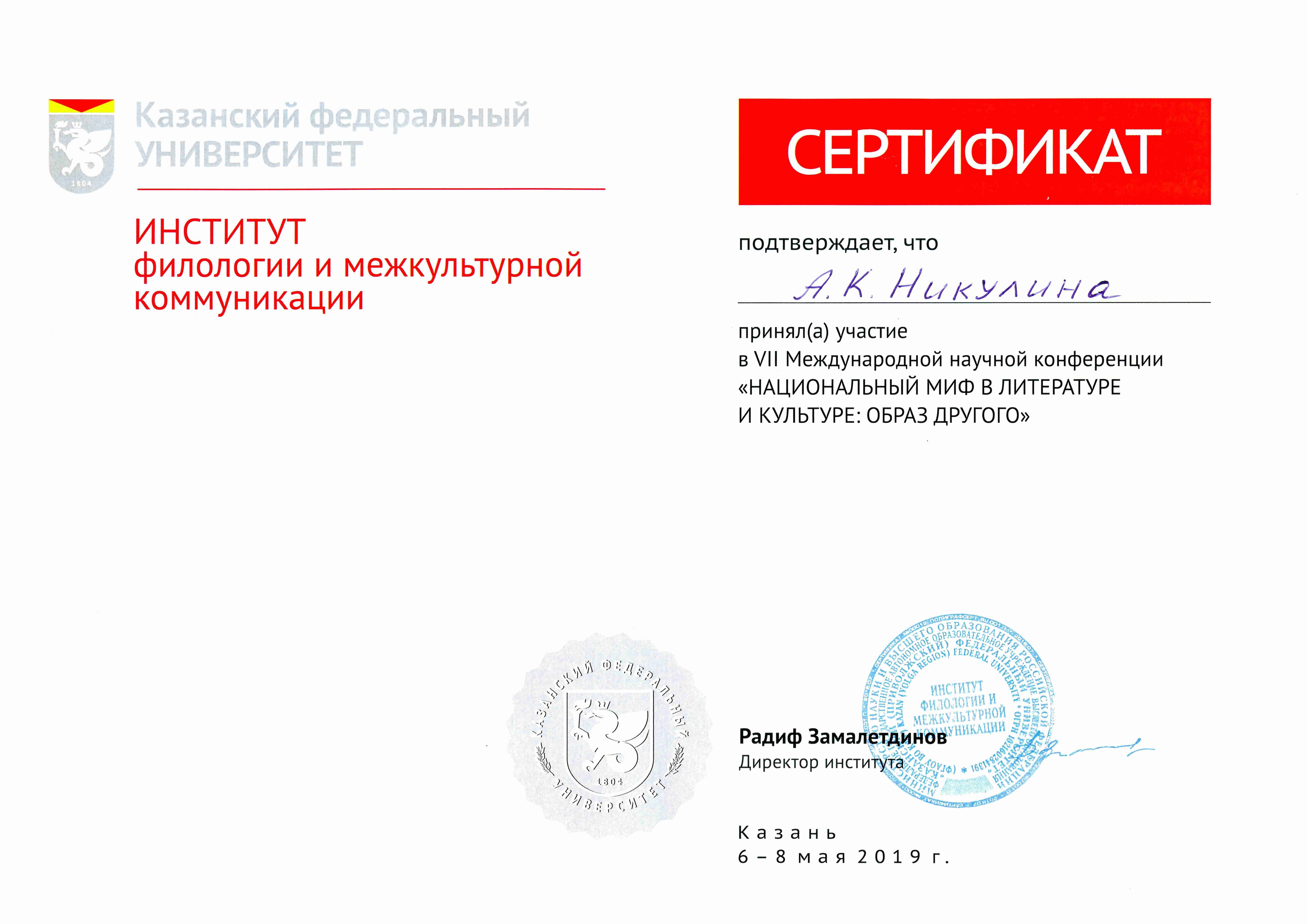 С 6 по 8 мая 2019 г. в Казанском (Приволжском) федеральном университете проходила VII Международная научно-практическая конференция «Национальный миф в литературе и культуре: образ Другого», в которой приняла участие доцент кафедры английского языка А.К. Никулина. На конференцию прибыли представители различных вузов из Австрии, Ирана, Казахстана, Беларуси, а также городов России, таких как Москва, Санкт-Петербург, Калининград, Воронеж, Волгоград, Пермь, Уфа, Нижний Новгород, Саранск и др. Проблема взаимоотношений с Другим как часть национального мировидения обсуждалась в связи с русской, английской, американской, татарской и другими литературами и культурами. Доклад А.К. Никулиной «Витгенштейновский контекст размышлений о проблеме Другого в философских романах Д.Ф. Уоллеса» был выслушан с большим интересом и рекомендован к опубликованию.