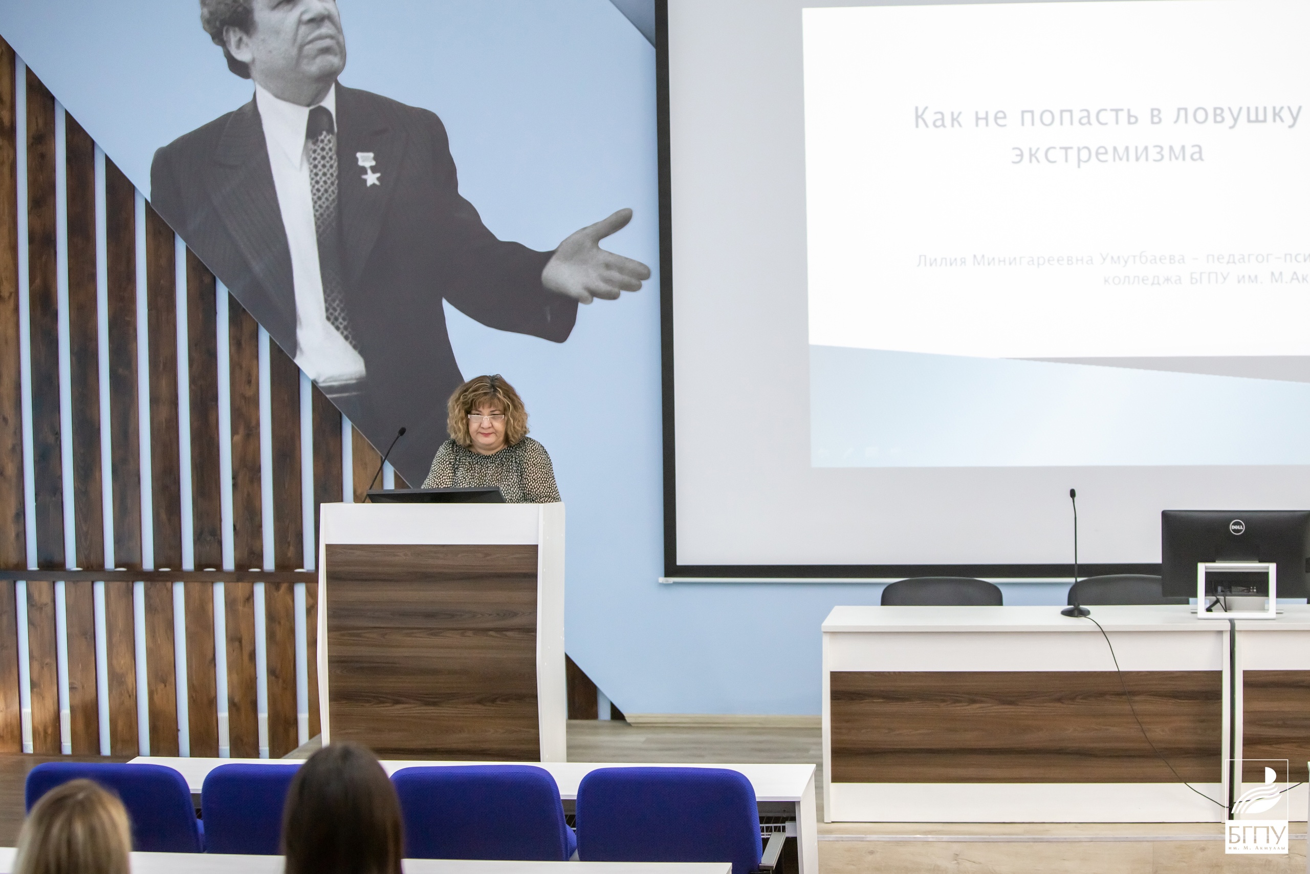 В мероприятии приняли участие студенты институтов и факультетов Башгоспедуниверситета. Тренинг провела педагог-психолог колледжа БГПУ им. М.Акмуллы Лилия Умутбаева. В ходе встречи были рассмотрены вопросы различного проявления экстремизма, как в молодёжной среде, так и в обществе в целом. Лилия Минигареевна рассказала студентам о преступных способах и методах вербовки молодежи, о роли сети интернет в распространении негативной идеологии. Также Лилия Умутбаева ознакомила с методами, с помощью которых можно оградить себя и своих близких от влияния деструктивных сект.