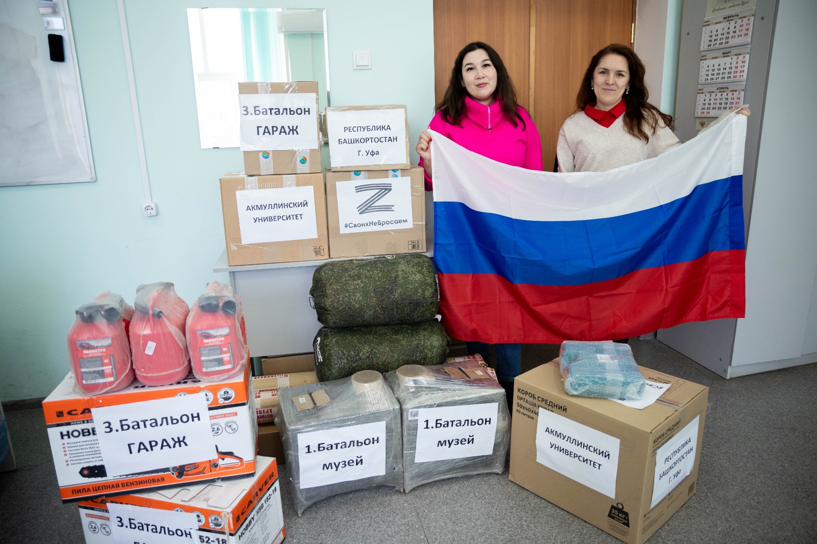 Собрали деньги и необходимые для бойцов вещи студенты и преподаватели Башкирского государственного педагогического университета имени Мифтахетдина Акмуллы, сотрудники РГО, сотрудники Уфимского федерального исследовательского центра Российской академии наук, лично председатель регионального отделения РГО, ректор Акмуллинского университета Салават Сагитов, генеральный директор ООО "Дорремстройтрест" Вячеслав Аброщенко. Технопарк «ХТЦ-УАИ. Росойл» передал бойцам несколько коробок с ружейным маслом.
