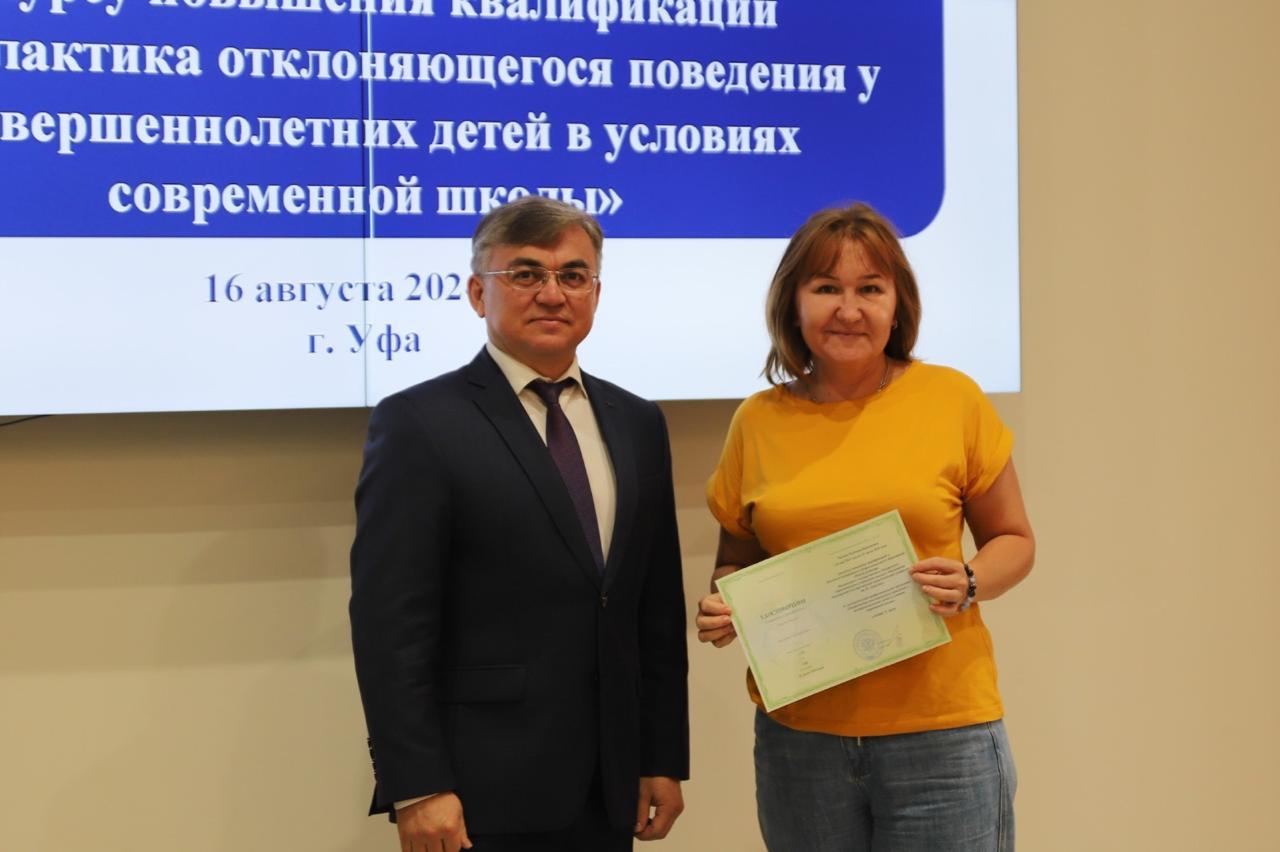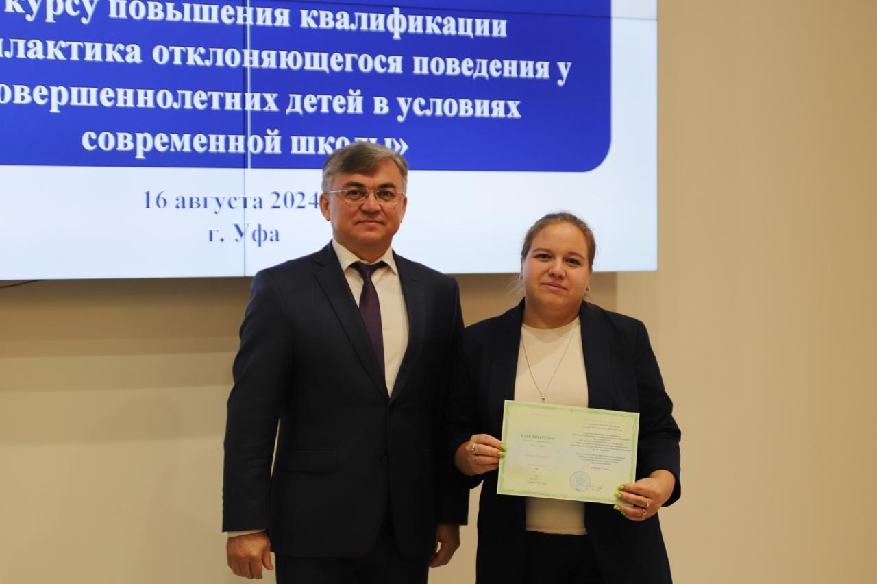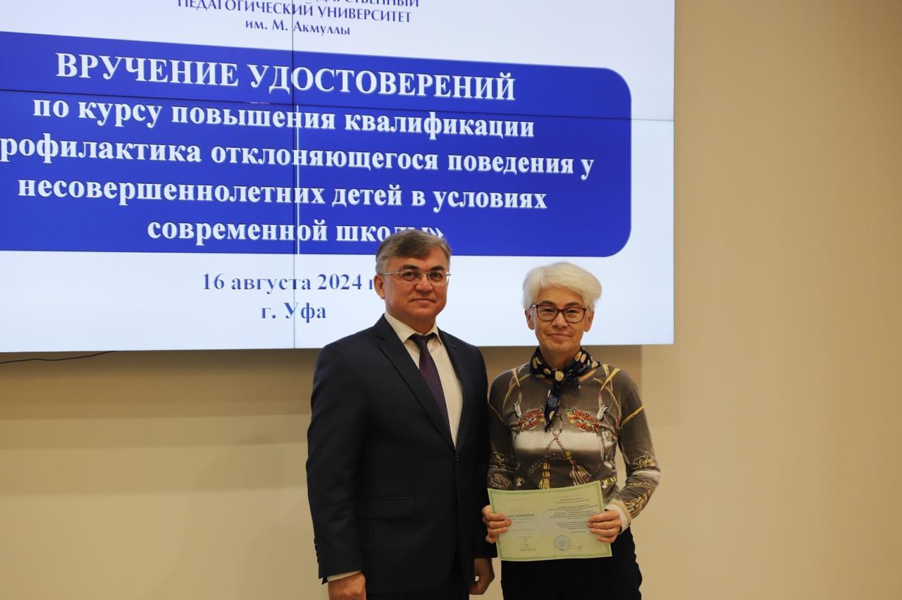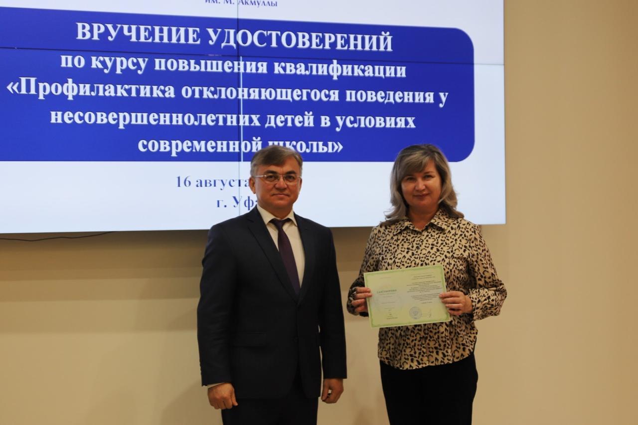 16 августа в Акмуллинском университете состоялось вручение удостоверений слушателям курса повышения квалификации «Профилактика отклоняющегося поведения у несовершеннолетних детей в условиях современной школы».