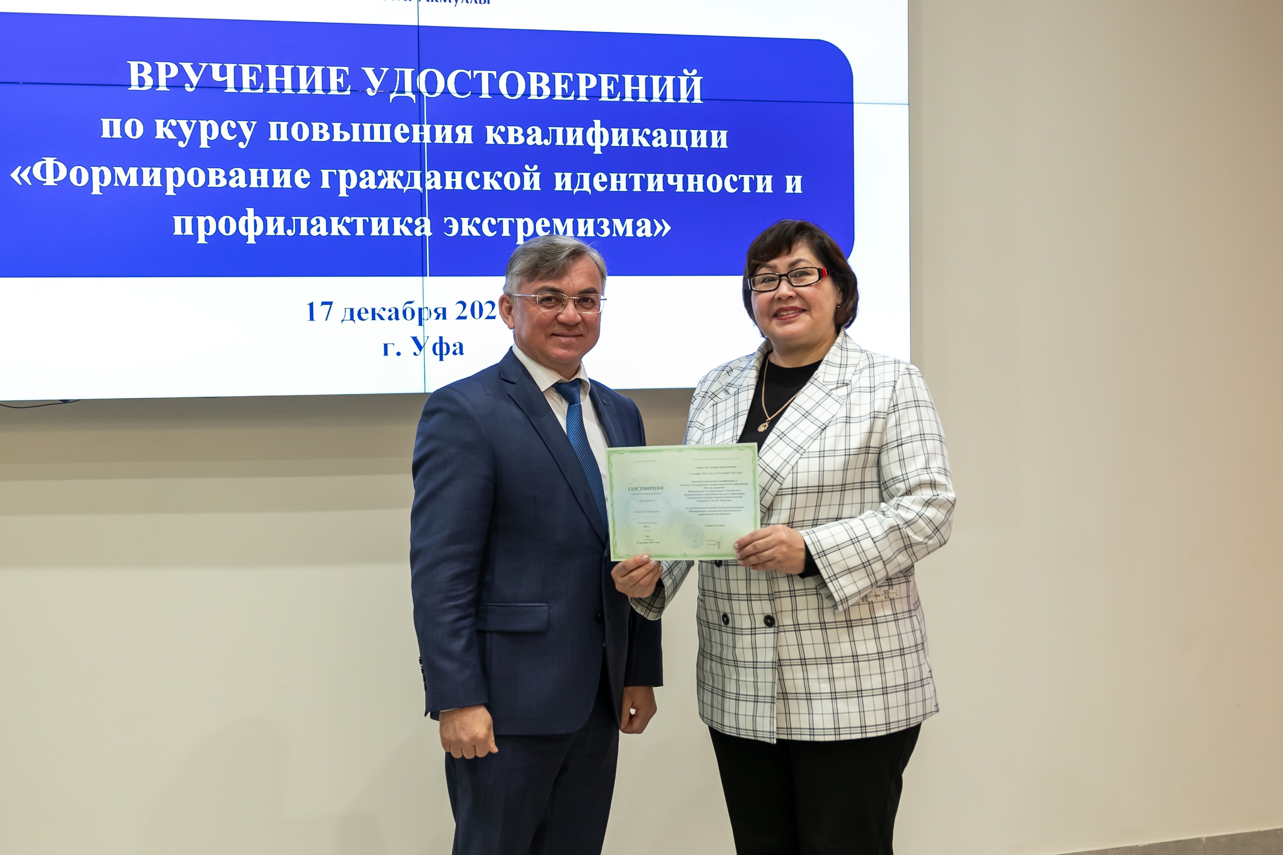 17 декабря состоялось вручение удостоверений слушателям курса повышения квалификации «Формирование гражданской идентичности и профилактика экстремизма». Обучение проходило в дистанционном формате с 21 октября по 2 декабря 2024 года. В рамках программы свои навыки успешно повысили педагогические работники города Уфы, а также Дюртюлинского и Чекмагушевского районов. Удостоверения о прохождении курса вручил слушателям директор Координационного центра по противодействию идеологии терроризма и экстремизма БГПУ им. М.  Акмуллы, советник при ректорате Ильгам Хабибуллин.