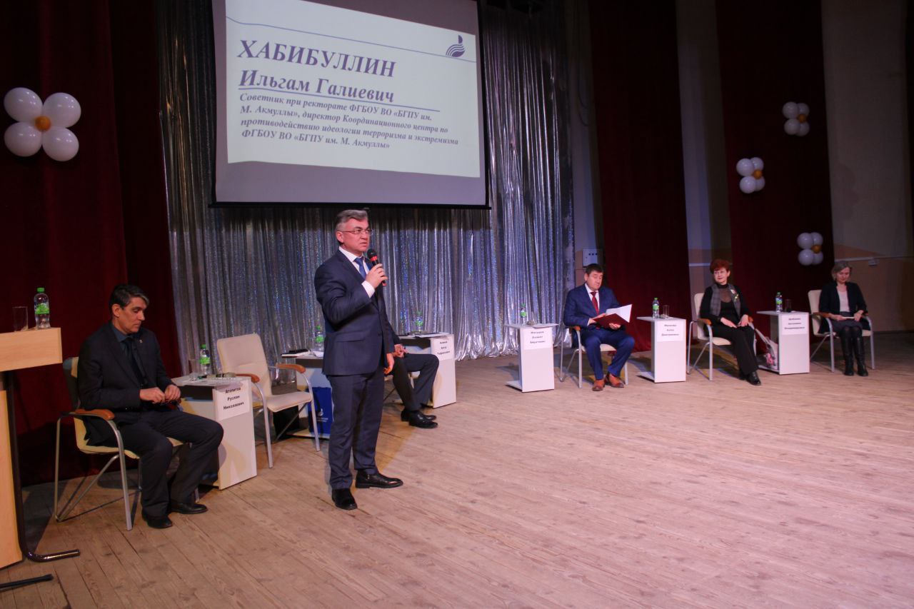 С приветственным словом выступил ректор Акмуллинского университета, депутат Государственного собрания – Курултая РБ Салават Сагитов. Он отметил, что противодействие угрозам экстремизма среди молодежи является ключевым направлением работы Координационного центра вуза, который проводит лекции и выездные мероприятия, где эксперты разъясняют, как бороться с этими негативными явлениями. Ректор пригласил педагогов принять участие в планируемых курсах повышения квалификации от Координационного центра .