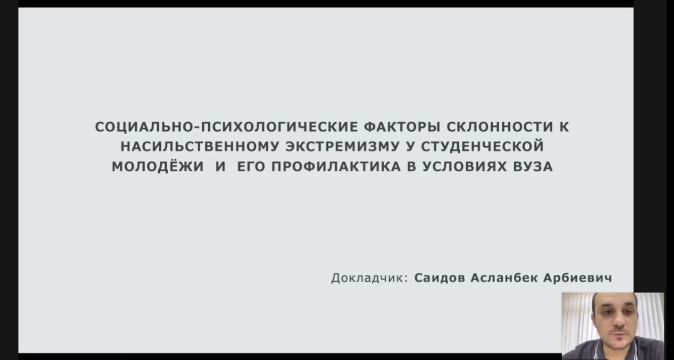 Саидов А.А. сосредоточился на социально-психологических аспектах проблемы. Он рассказал о факторах, способствующих склонности обучающихся к насильственному экстремизму, и методах его профилактики в условиях вуза. Спикер отметил, что важно не только распознавать признаки радикализации, но и своевременно принимать меры для их нейтрализации. Он также поделился практическими рекомендациями, которые помогут предотвратить развитие экстремистских настроений среди молодежи.