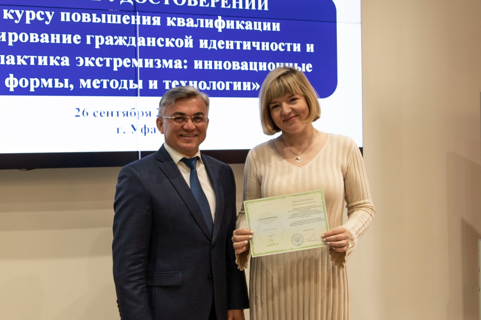 В рамках реализации государственного задания Министерства просвещения Российской Федерации  26 сентября 2025 года прошла торжественная выдача удостоверений курсов повышения квалификации «Формирование гражданской идентичности и профилактика экстремизма: инновационные формы, методы и технологии».