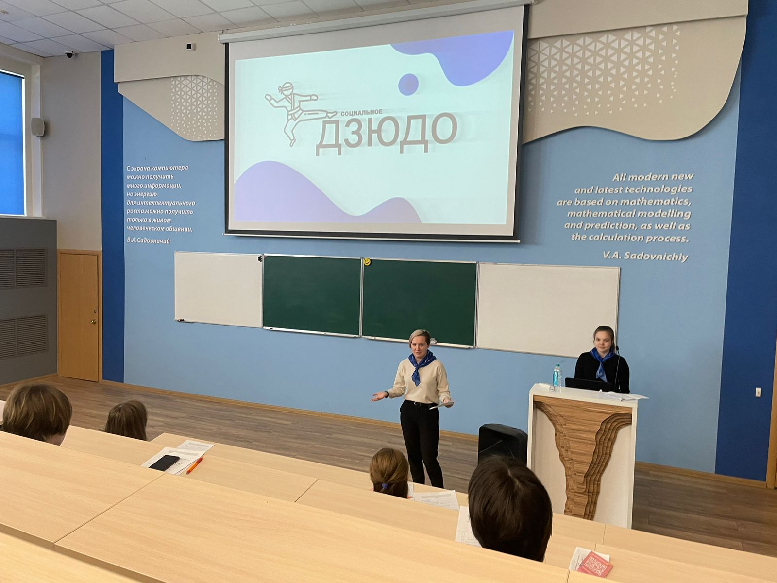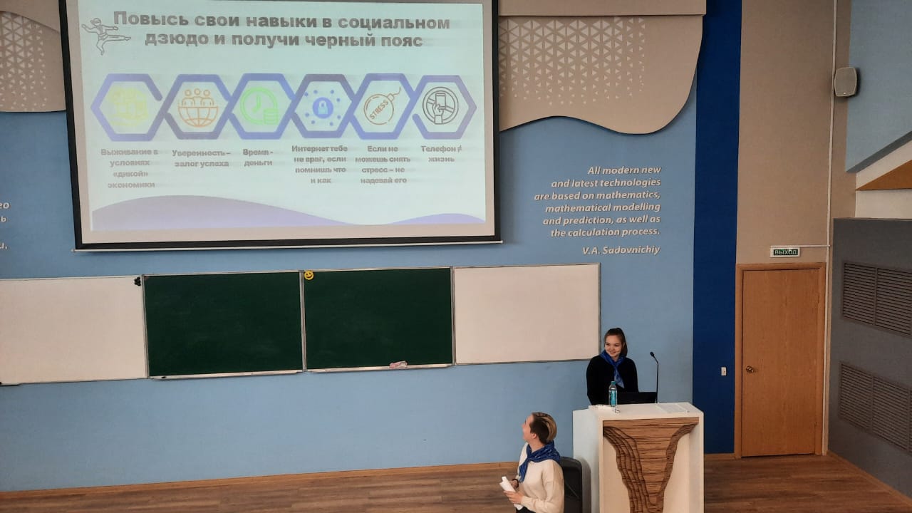 27 апреля 2024 г. в Акмуллинском университете прошел День открытых дверей. В этот день студентки Центра развития компетенций "Адитон" (Сабельникова Анастасия, Садыкова Айсылу, Секова Аида) провели для гостей интенсив "Социальное дзюдо". Будущие абитуриенты проверили свои знания по нескольким направлениям: «Выживание в условиях «дикой экономики», «Уверенность – залог успеха», «Время – деньги», «Интернет тебе не враг, если помнишь что и как», «Если не можешь снять стресс – не надевай его», «Телефон ≠ жизнь». Самые активные участники были награждены ценными призами.
