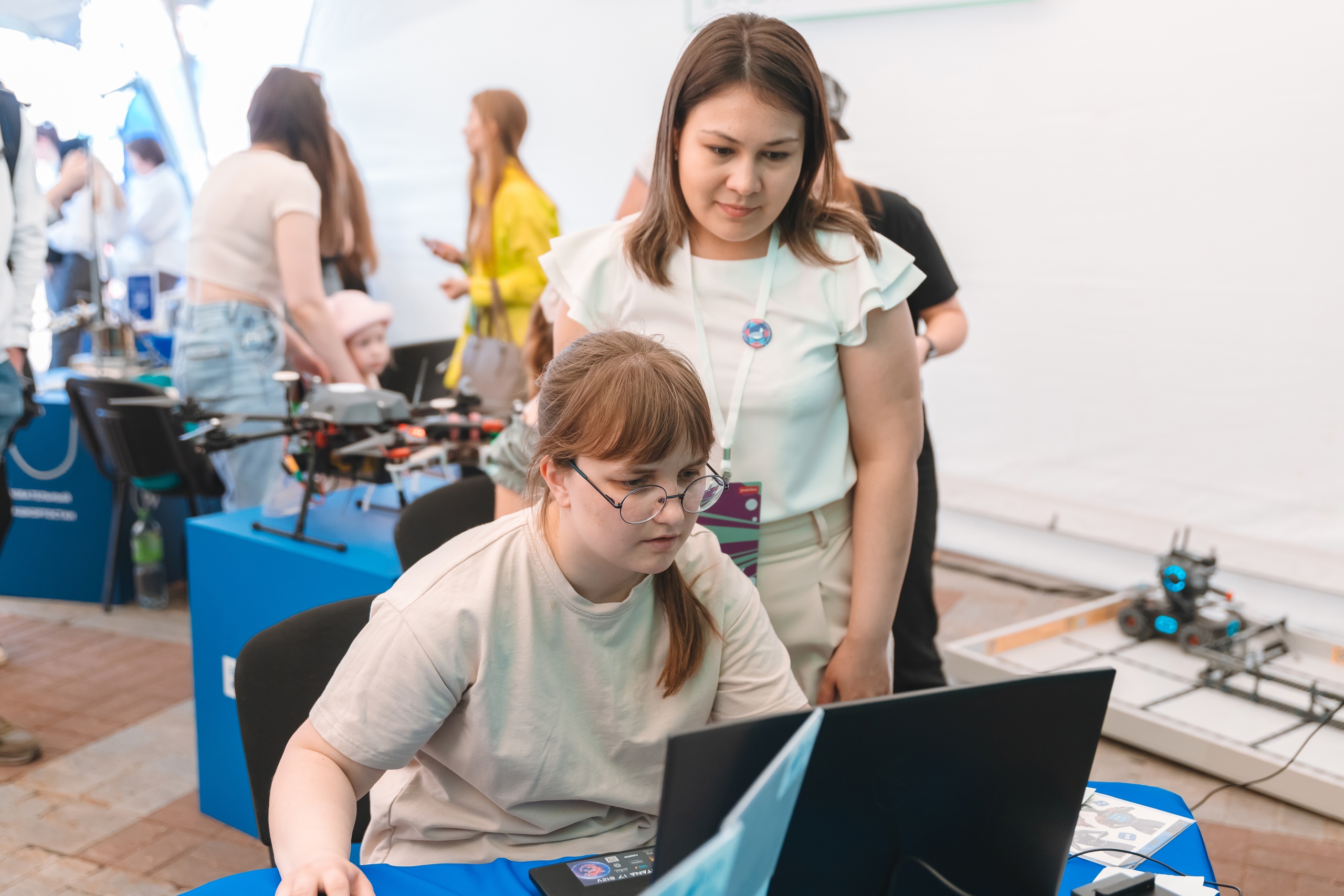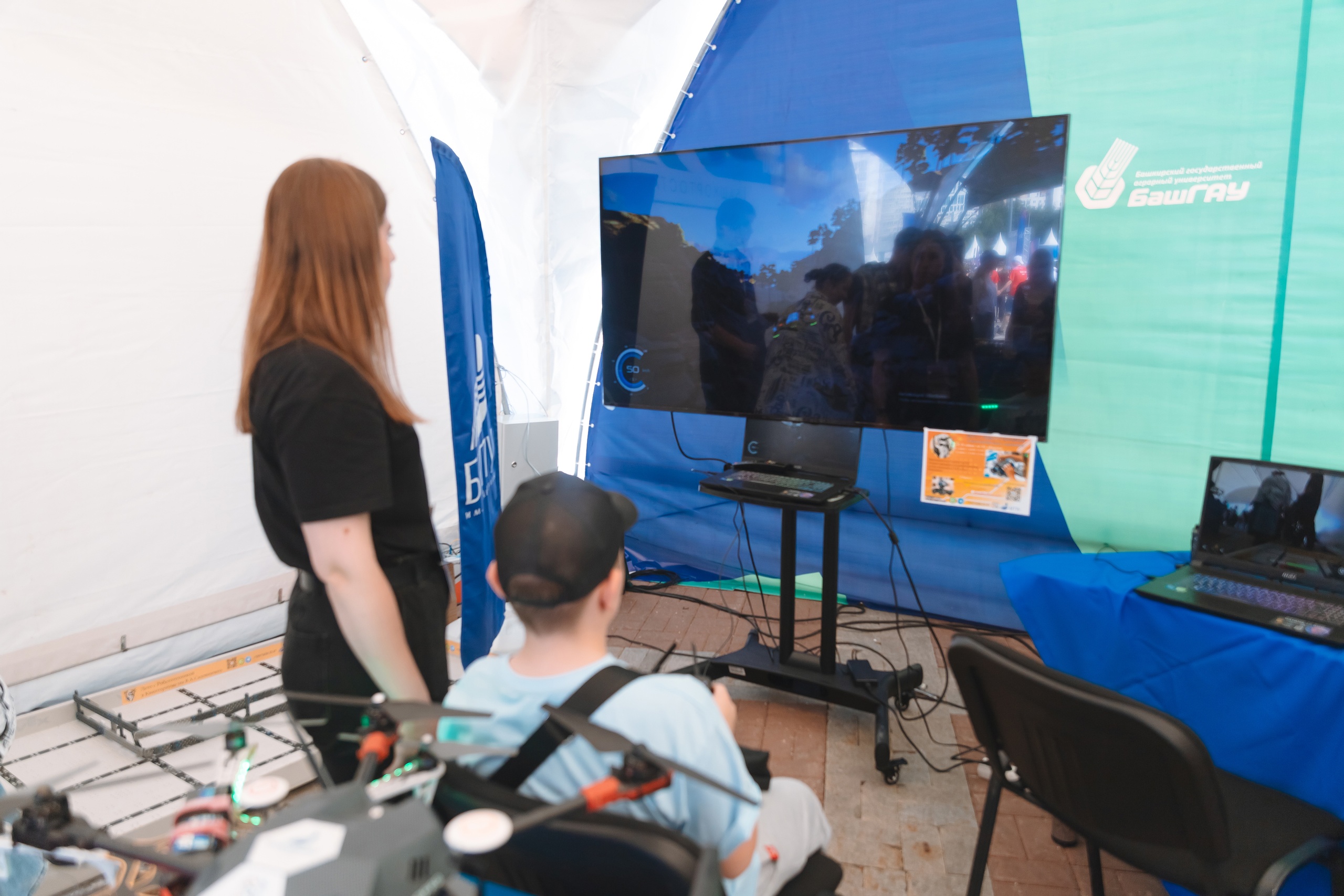 Студенты Института физики, математики, цифровых и нанотехнологий знакомили всех желающих с виртуальным тренажёром по управлению беспилотными летающими аппаратами и робо-биатлоном.