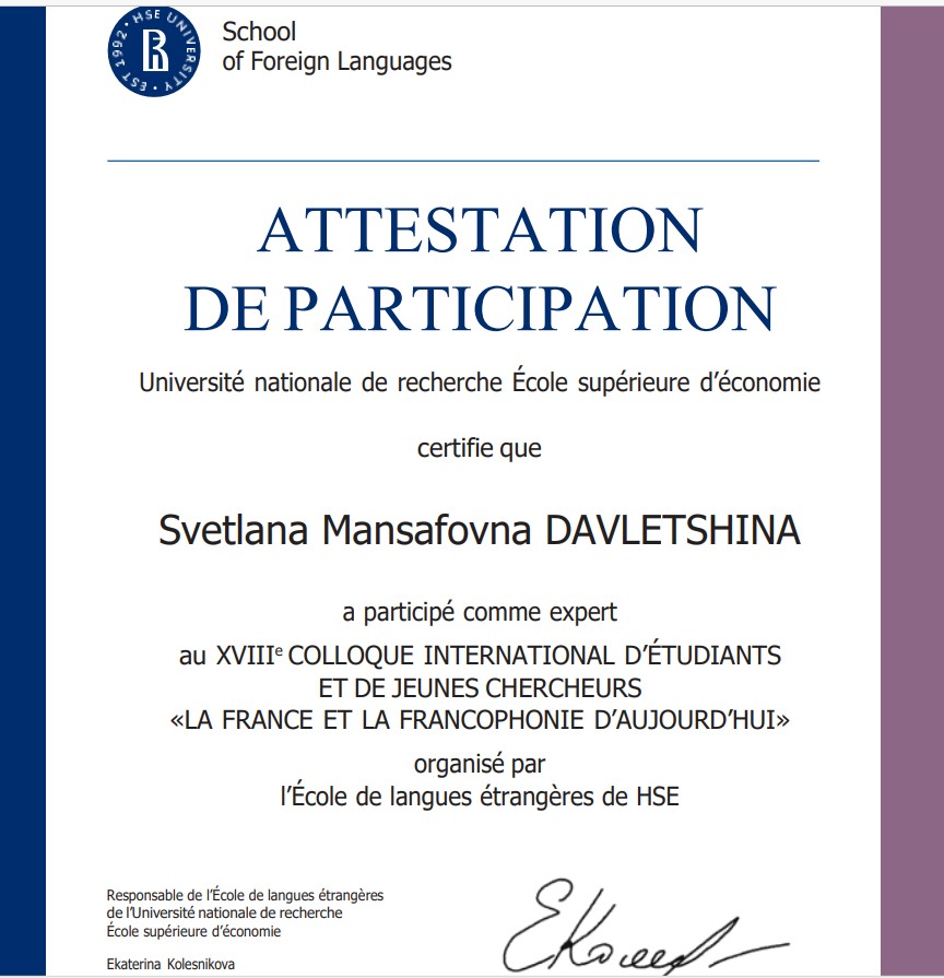 Преподаватели кафедры романо-германской филологии и методики обучения иностранным языка, к.ф.н., доцент С.М.Давлетшина и к.п.н, доцент З.Р.Киреева приняли участие в качестве экспертов  в XVIII Международной научной конференции «Франция и Франкофония сегодня», организованной Центром вторых иностранных языков Школы иностранных языков Национального исследовательского университета «Высшая школа экономики». В рамках конференции, которая проводится каждый год и направлена на укрепление диалога культур России и стран Франкофонии, студенты и аспиранты разных вузов представили свои исследования на французском языке в семи тематических секциях: