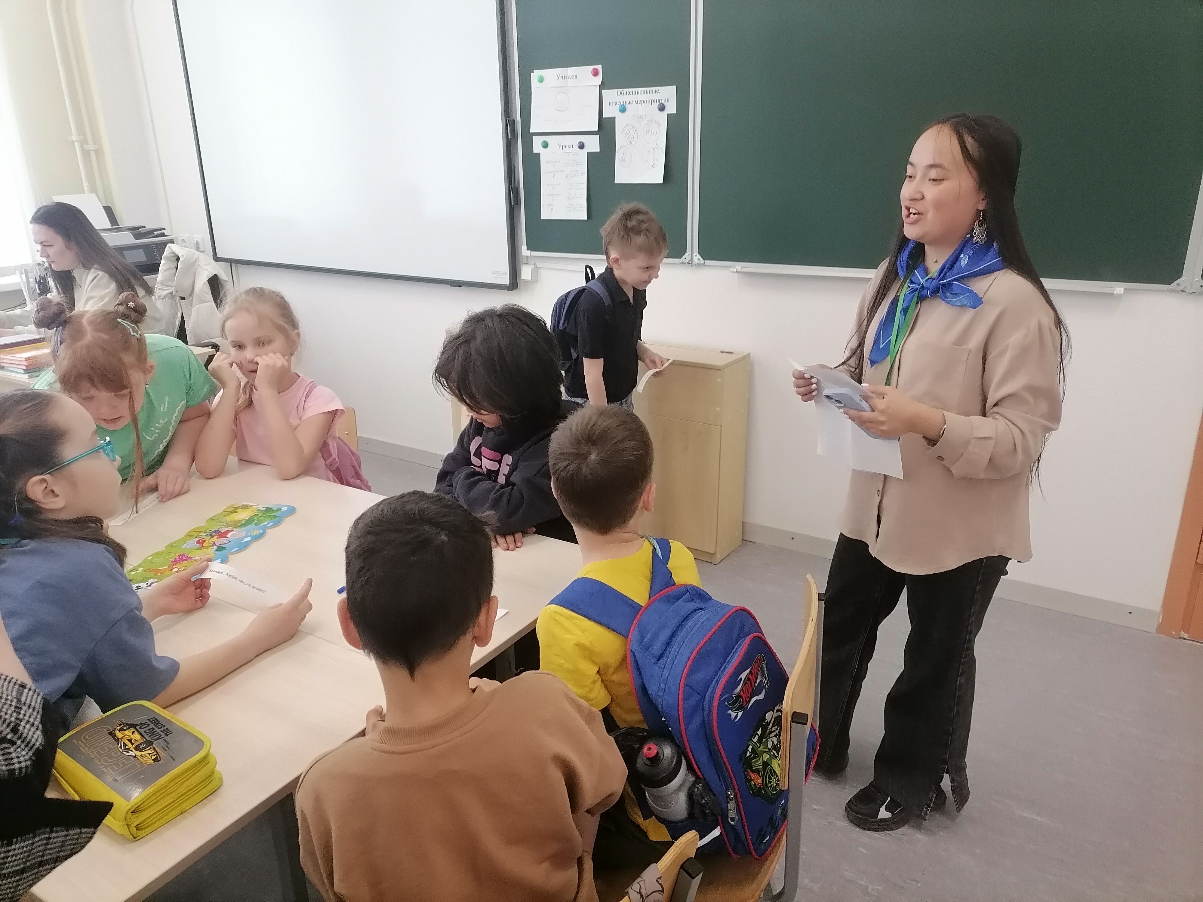 На станции «Русский язык» студенты ПОРЯЛ-21-22 Софья Кузнецова и Ангелина Путулян предложили детям соединить начало и конец русских пословиц о дружбе, семье и труде. Студентка 3 курса факультета башкирской филологии Айзиля Вахитова (группа ПОБЯ_АНЯ-31-21) разыграла с детьми известную всем детям сказку Репка в переводе на башкирский язык.