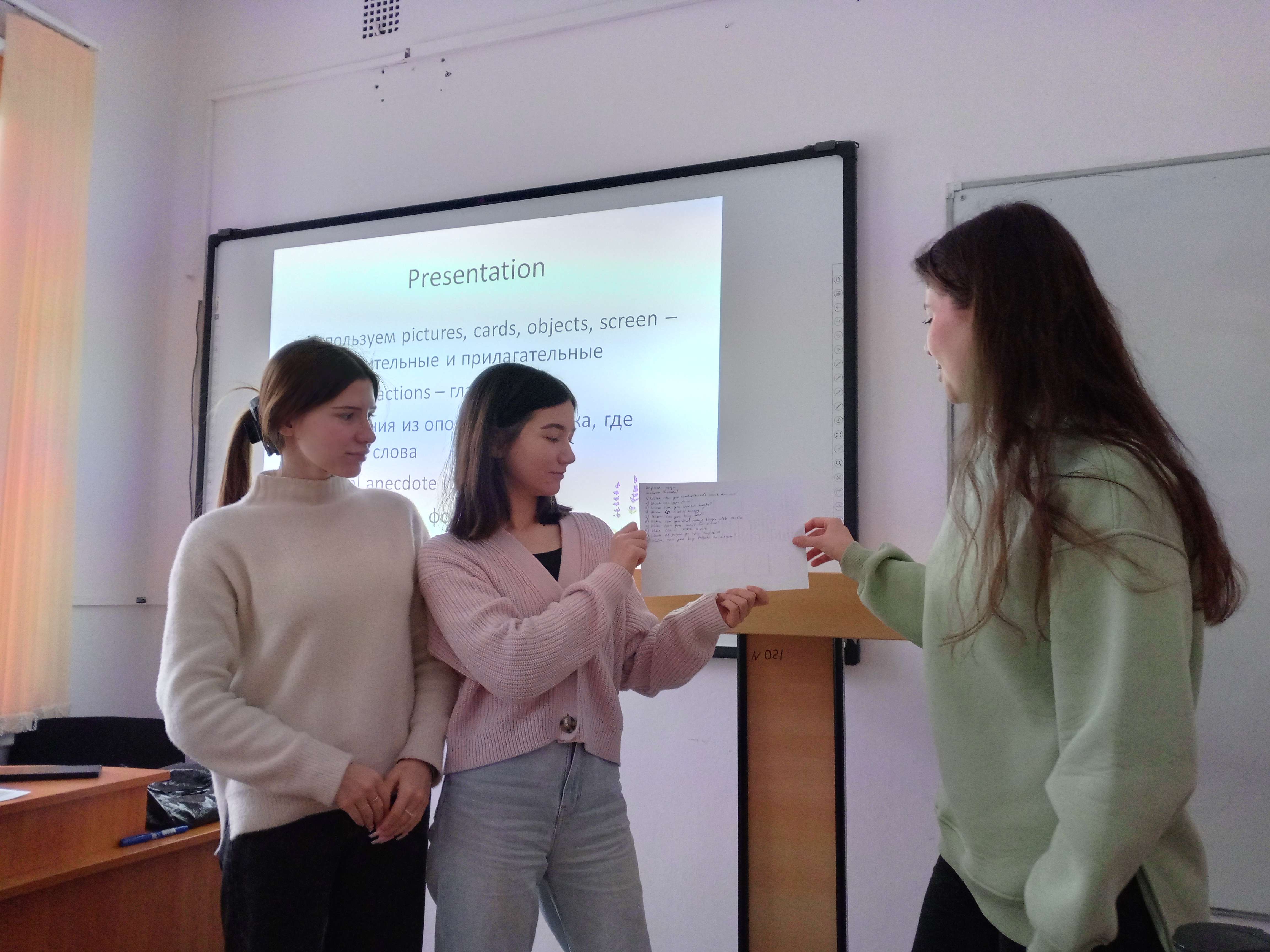 Были подробно представлены этапы урока английского языка, а именно какие методические приемы необходимо использовать в начале урока, чтобы настроить учеников на рабочий лад. Как следует проверять домашнюю работу. Как вводить новую тему, как отрабатывать изученный материал, как подводить итоги урока.  Студентам было предложено провести фрагменты урока, а именно этап – представление нового материала.  Студенты подошли к решению данной задачи творчески, разделившись на малые группы и работая совместно