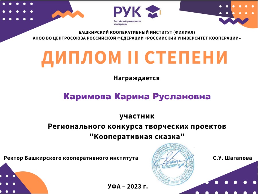 В последней декаде декабря 2023 года на базе Башкирского кооперативного института (филиал Российского университет кооперации)  состоялся Региональный конкурс творческих проектов «Кооперативная сказка». Конкурс проводился с целью повышения экономической и финансовой грамотности населения в целом и молодежи в частности. Задачами регионального конкурса стали: