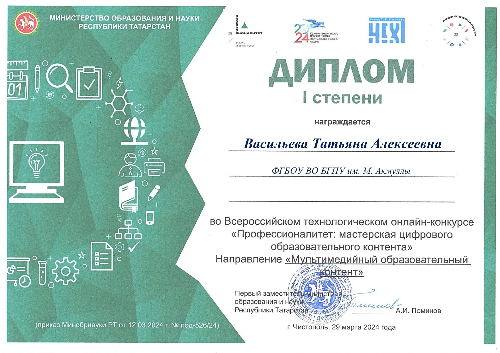 Поздравляем Васильеву Татьяну Алексеевну, председателя цикловой комиссии специальности 09.02.07 «Информационные системы и программирование» Колледжа БГПУ им.М.Акмуллы, с победой во Всероссийском технологическом онлайн-конкурсе «Профессионалитет: мастерская цифрового образовательного контента»!