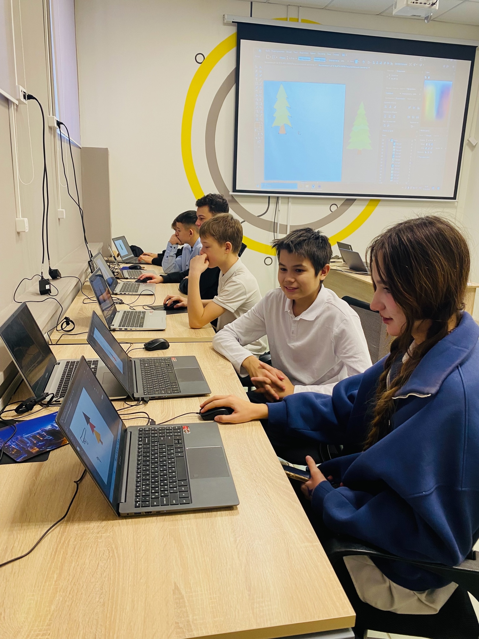 В первой половине творческих занятий ребята изучили программу Adobe Illustrator, ее главные возможности, а также создали свой проект «Новогодняя сказка». Научились работать с фигурами, слоями и текстурами.