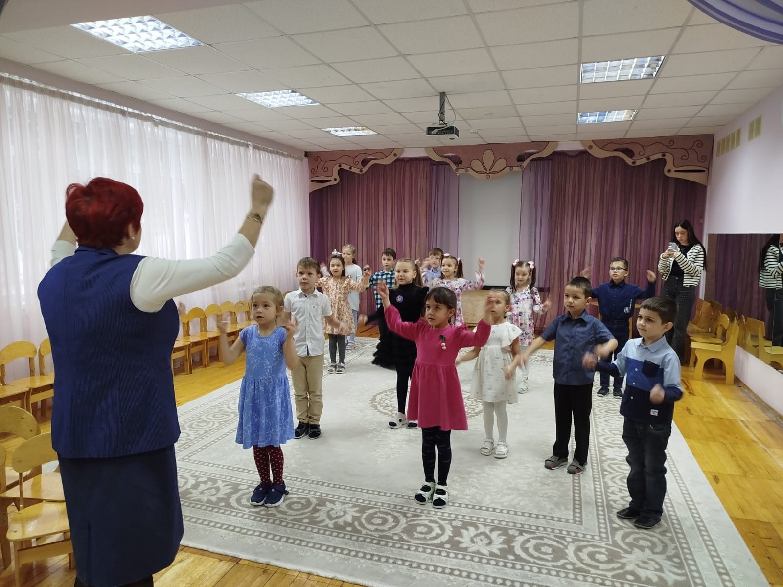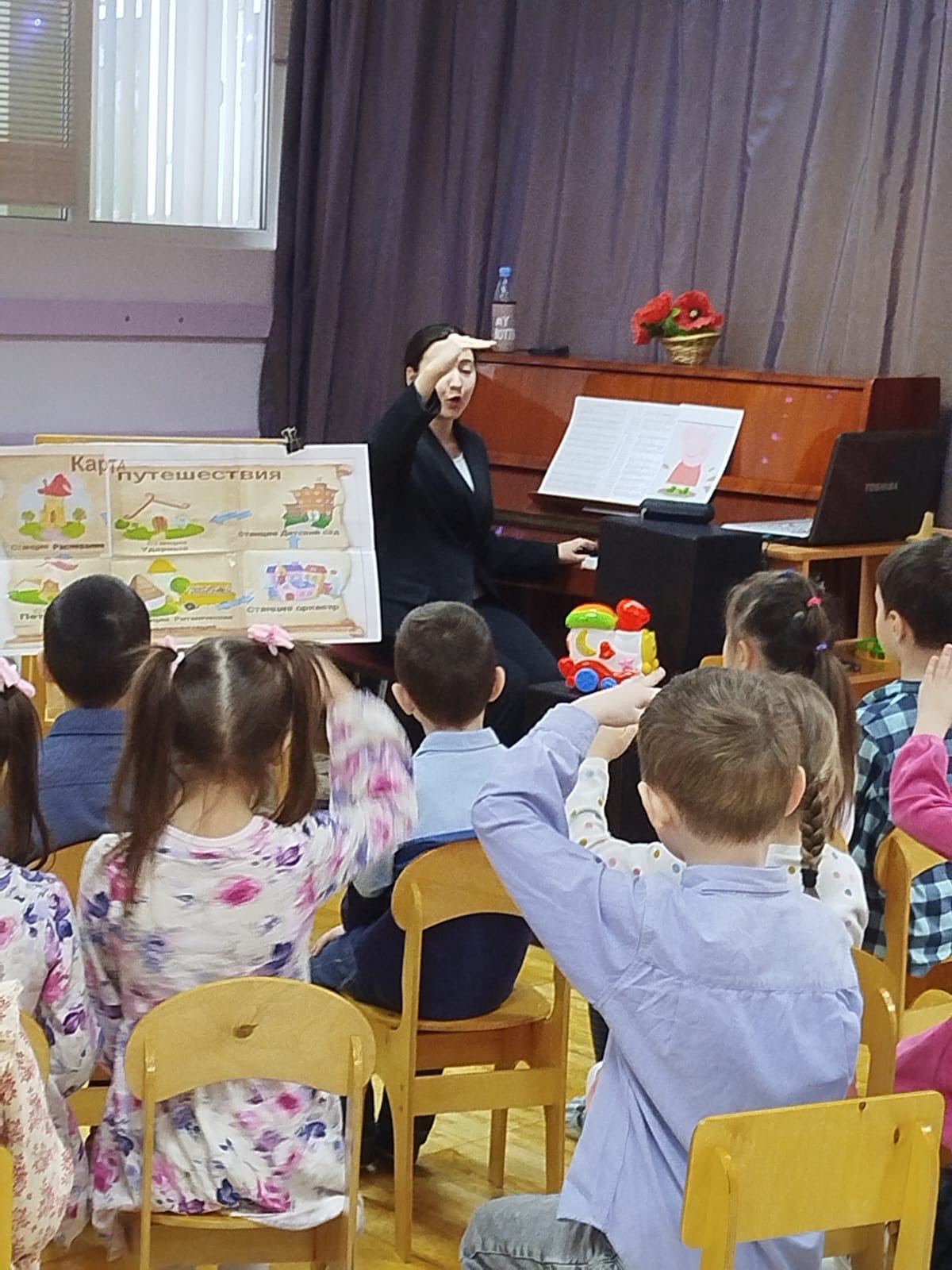 Ребята подготовительной группы "Одуванчики" вместе с преподавателем Колледжа Юферовой Альбиной Адонисовной отправились в страну музыкальных инструментов. В ходе путешествия ребята закрепили знания о музыкальных инструментах, побывали на станции распевания и ритмической импровизации и узнали, что наше тело - настоящий оркестр. Альбина Адонисовна познакомила детей с направлением "боди-перкуссия", в котором тело используется в качестве музыкального инструмента в виде хлопков, щелчков, притопов и т.п.