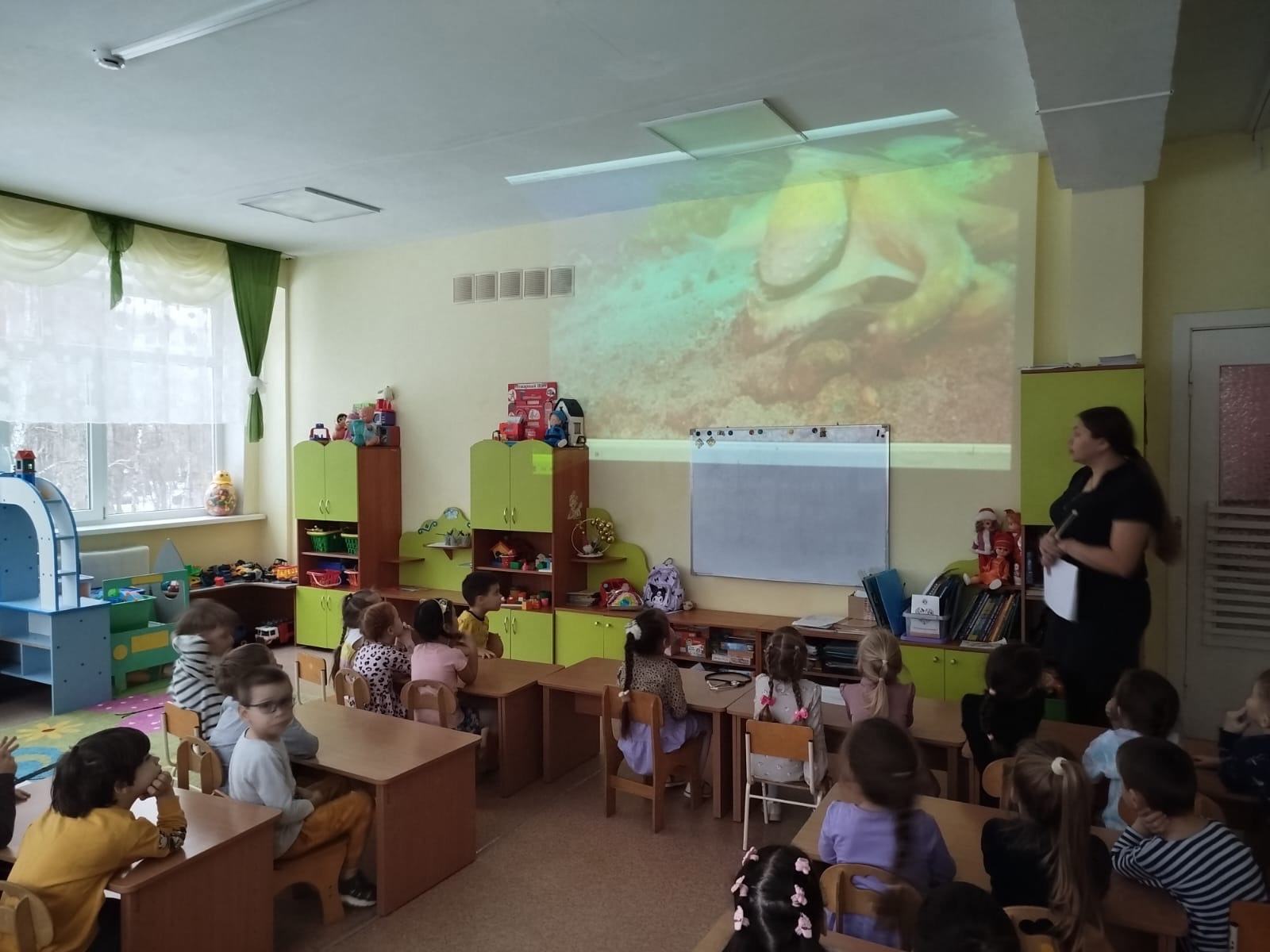 Старшая группа "Ромашки" под руководством преподавателя Колледжа Зариповой Елены Константиновны отправилась в путешествие по морским глубинам. В процессе виртуальной экскурсии ребята встретились с осьминогом - одним из самых быстрых морских обитателей. С помощью экспериментального оборудования лаборатории "Наураша" ребята смогли измерить пульс самому осьминогу и сравнить частоту его пульса с пульсом человека. Оказалось, что пульс человека намного быстрее, чем у осьминога, а связано это с холоднокровностью морского обитателя.