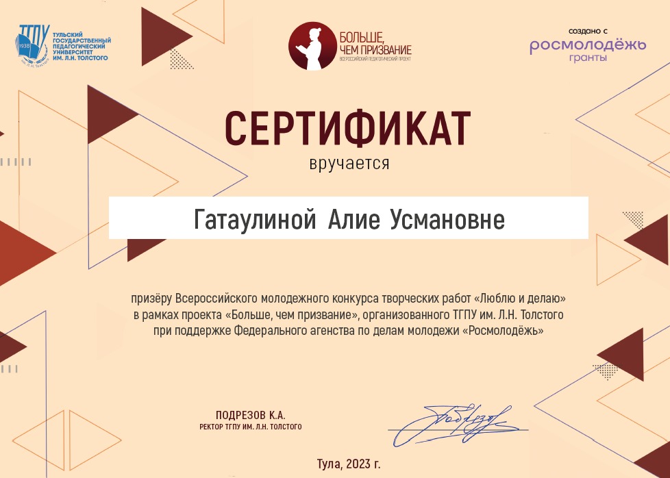Поздравляем лидера философского клуба «Генезис» Гатаулину Алию, которая стала призером Всероссийского молодежного конкурса творческих работ «Люблю и делаю» в рамках проекта «Больше, чем призвание», организованного ТГПУ им. Л.Н. Толстого при поддержке Федерального агентства по делам молодежи «Росмолодежь», прошедшего в Туле.