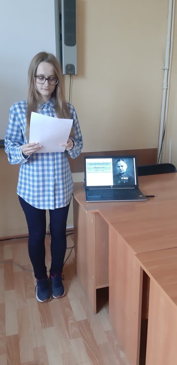 В рамках акции "Россия - страна героев"  доцентом кафедры межкультурной коммуникации и перевода Е.В. Ивановой был проведён кураторский час в группе ЛИНПП 21-20, посвящённый советскому военачальнику Минигали Шаймуратову. Студентка группы Анастасия Копысова презентовала биографию генерала на английском языке. После выступления последовало небольшое обсуждение, студенты задавали вопросы и дополняли биографию.