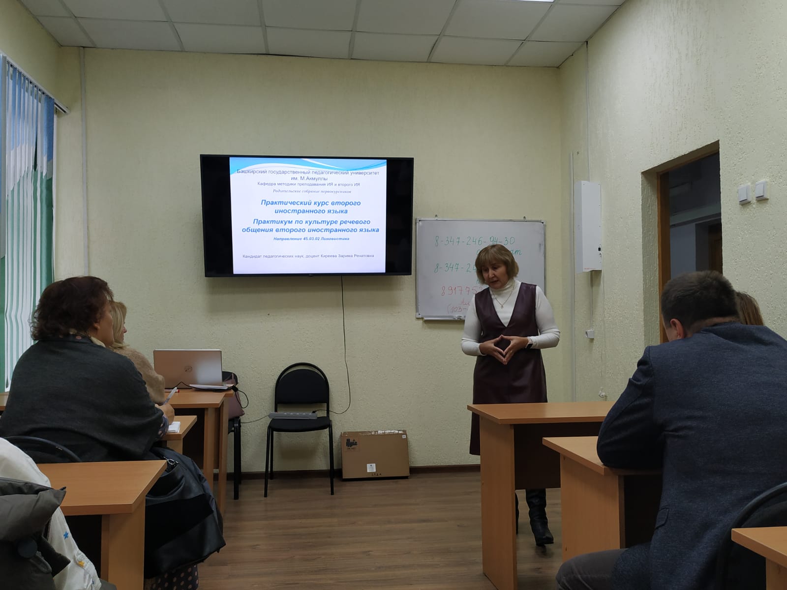 26 ноября 2022г. в Институте филологического образования и межкультурных коммуникаций прошло собрание родителей первокурсников. Вначале родители познакомились с руководством ИФОМК, кураторами групп и студенческим активом. Затем состоялась встреча с кураторами курсов и преподавателями-предметниками. Для каждого направления ИФОМК была определена отдельная аудитория. Перед родителями студентов 1 курса направления Лингвистика (Перевод и переводоведение) выступили: З.Р. Киреева, преподаватель Практического курса второго иностранного языка (французского), Г.С. Ситдикова, куратор 1 курса и преподаватель Практического курса первого иностранного языка (английского), О.Г. Дудочкина, преподаватель Практического курса иностранного языка (английского), и А.Г. Губайдуллина, куратор 1 курса. Ознакомившись с требованиями, предъявляемыми к студентам ИФОМК, а также особенностями воспитательной работы в институте, родители в личном общении с преподавателями узнали о текущих результатах своих детей и посещаемости ими занятий. Встреча прошла плодотворно в благожелательной атмосфере.