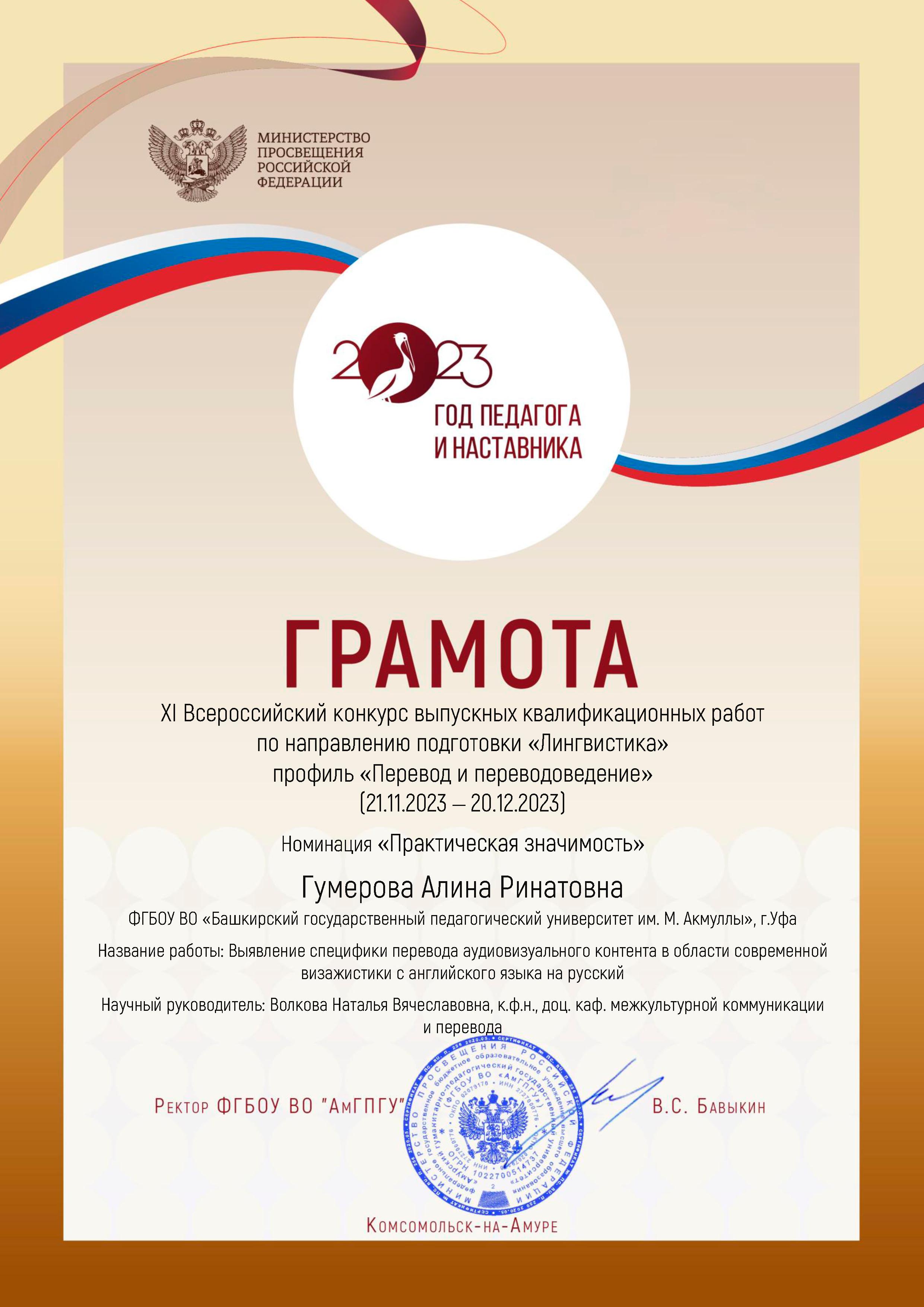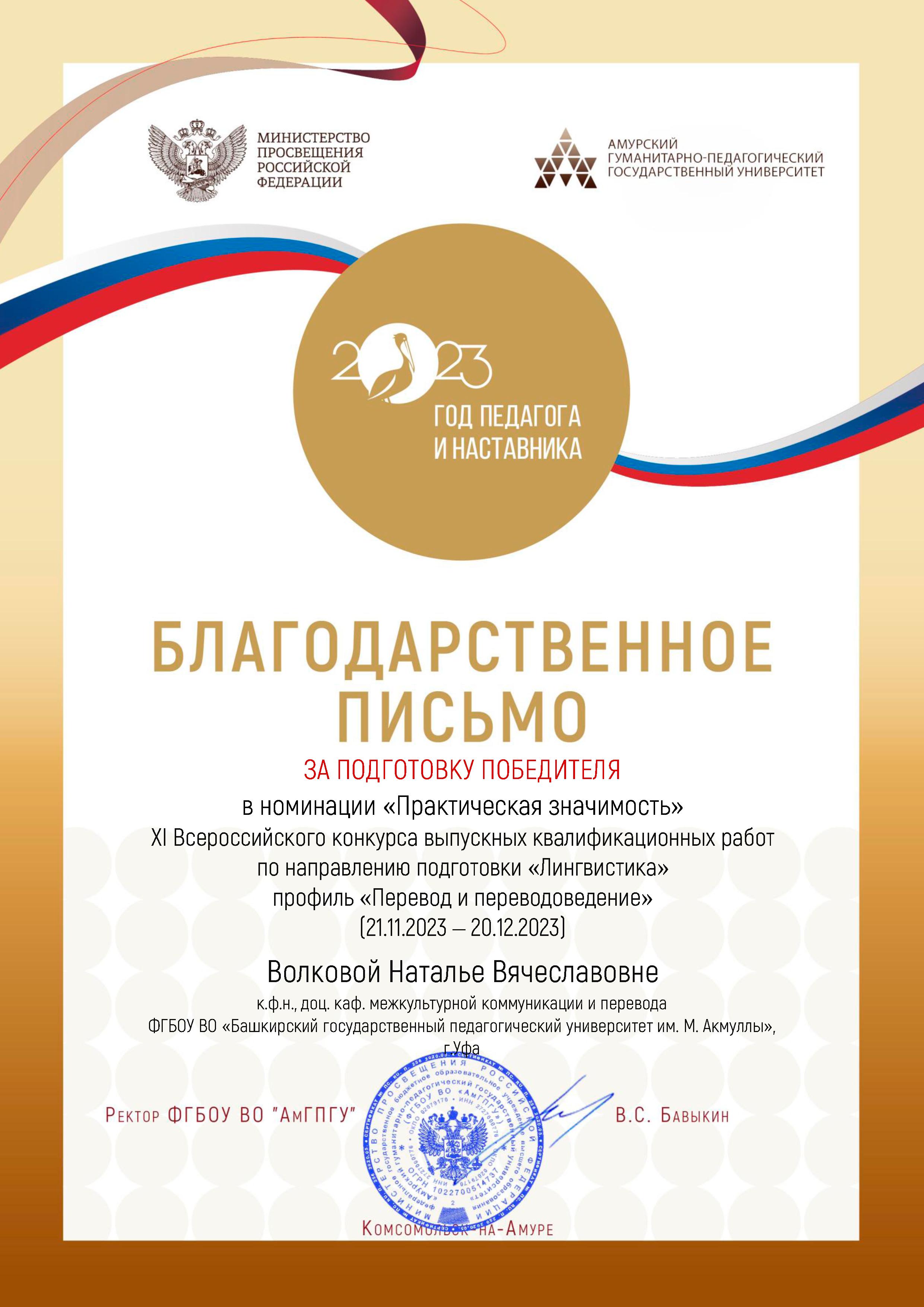 Ректор АмГПГУ Виктор Станиславович Бавыкин выразил благодарность к.ф.н., доценту кафедры межкультурной коммуникации и перевода Волковой Наталье Вячеславовне за подготовку Гумеровой А.Р. -  победителя XI Всероссийского конкурса выпускных квалификационных работ по направлению подготовки Лингвистика, профиль "Перевод и переводоведение" в номинации "Практическая значимость".