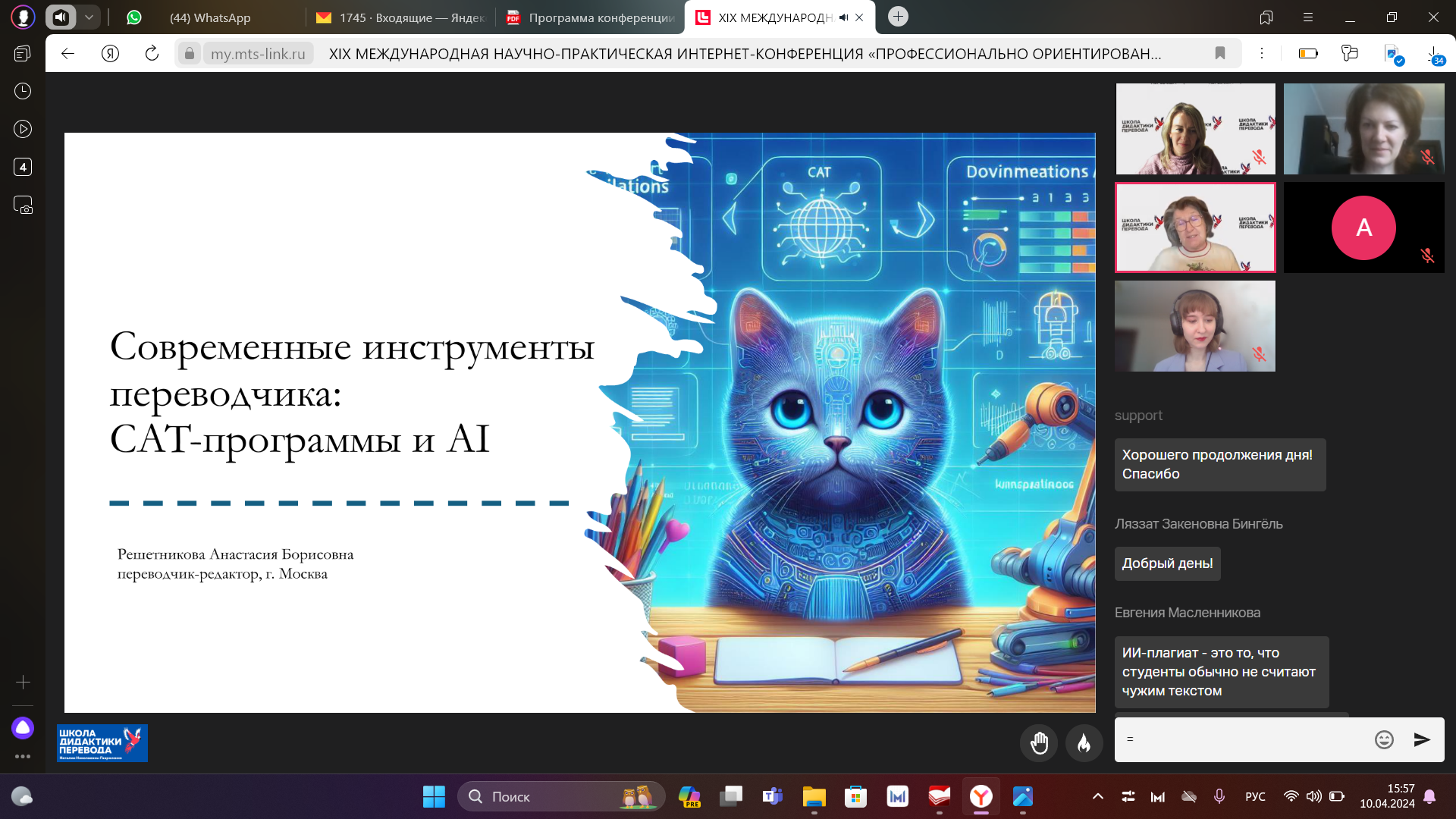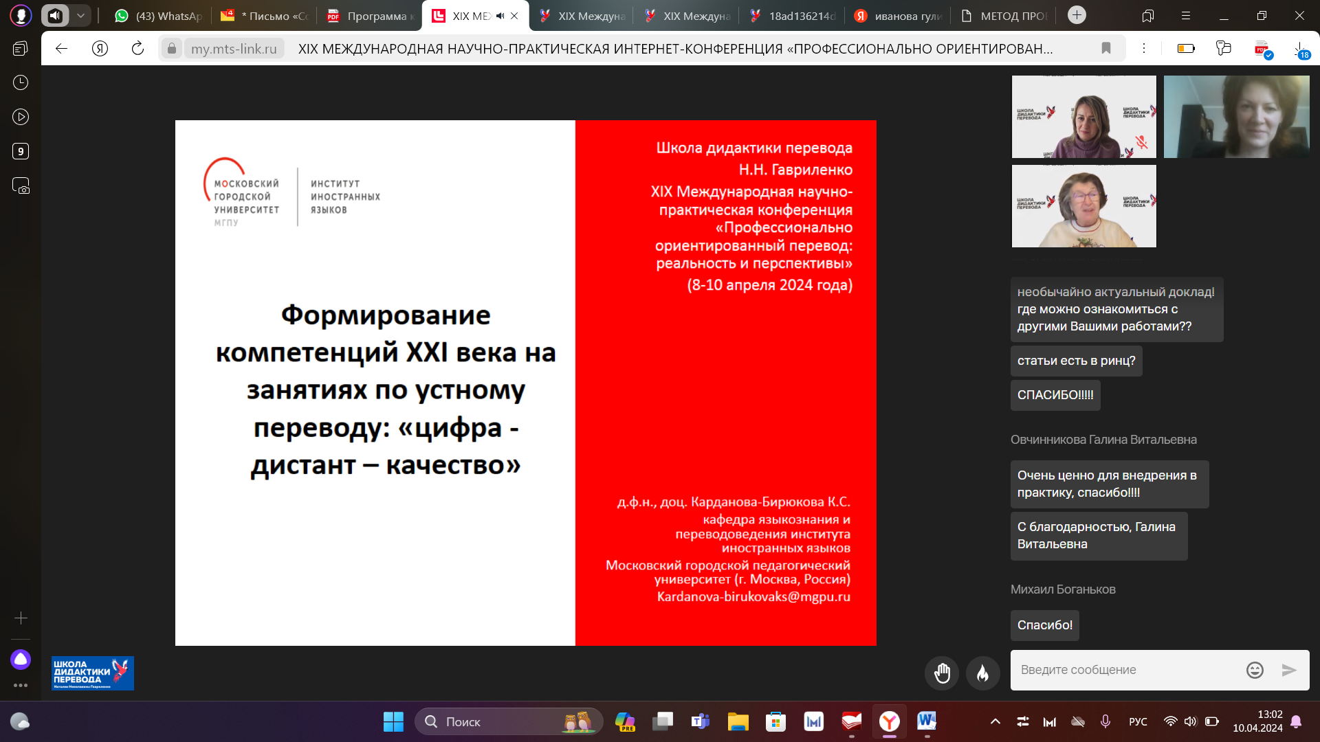 8-10 апреля 2024 г. состоялась  XIX Международная научно-практическая интернет-конференция «Профессионально-ориентированный перевод: реальность и перспективы». Организаторами конференции стали ведущие вузы Российской федерации и переводческие организации: РУДН, МГЛУ, МГПУ, ЧГУ, Ассоциация преподавателей перевода, Союз переводчиков России, Бюро переводов «АКМ-Вест» и Школа дидактики перевода.