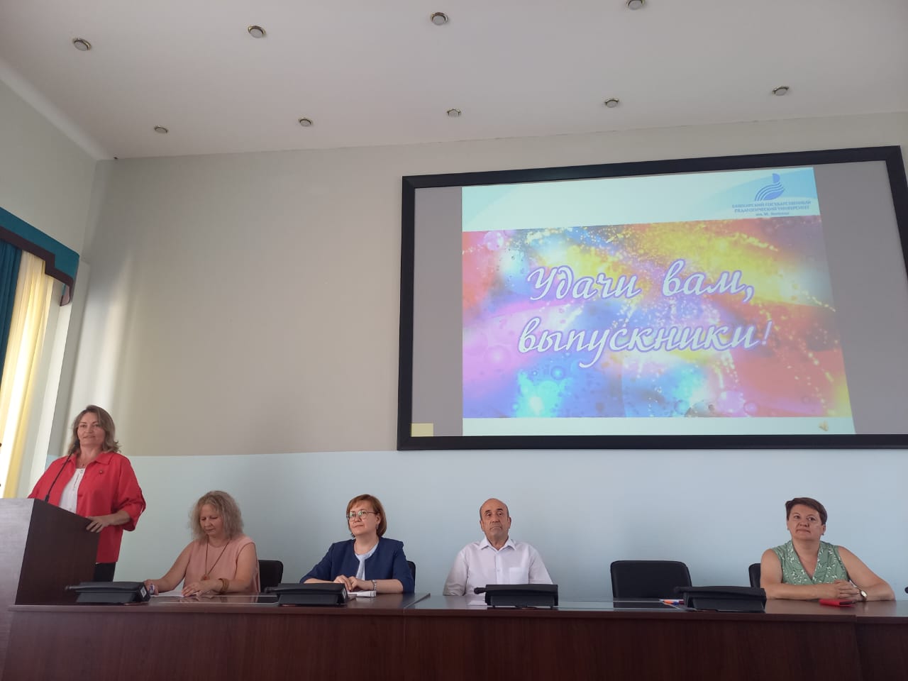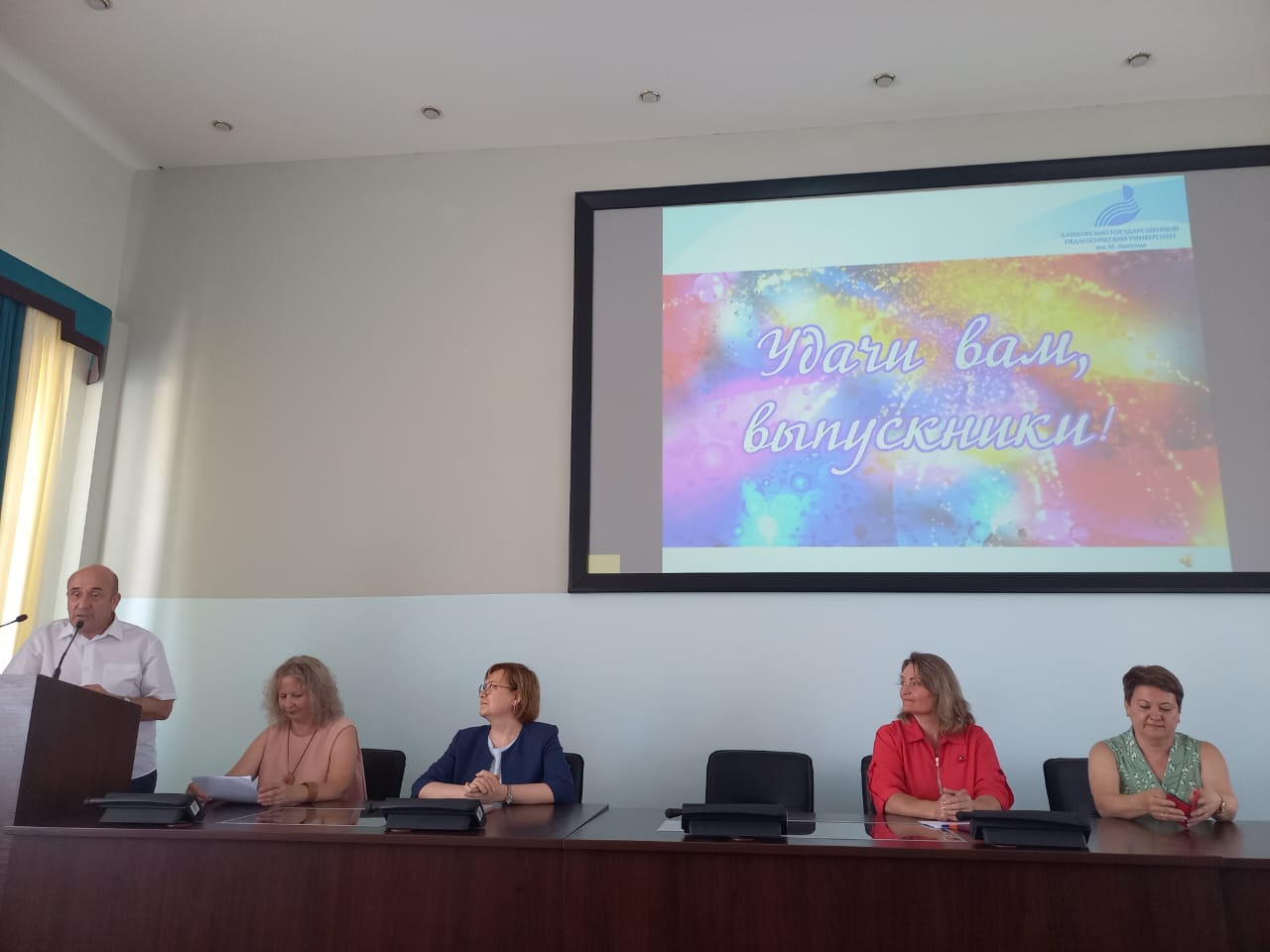 Выпускников поздравили:  начальник управления государственной политики в сфере общего образования министерства образования и науки Республики Башкортостан Жанна Вильевна Минекеева и выпускник нашего университета, учитель английского языка высшей квалификационной категории, заместитель директора по учебно-воспитательной работе гимназия № 3 им. М. Горького (г. Уфа) Байбурин Эльгиз Мидхатович.