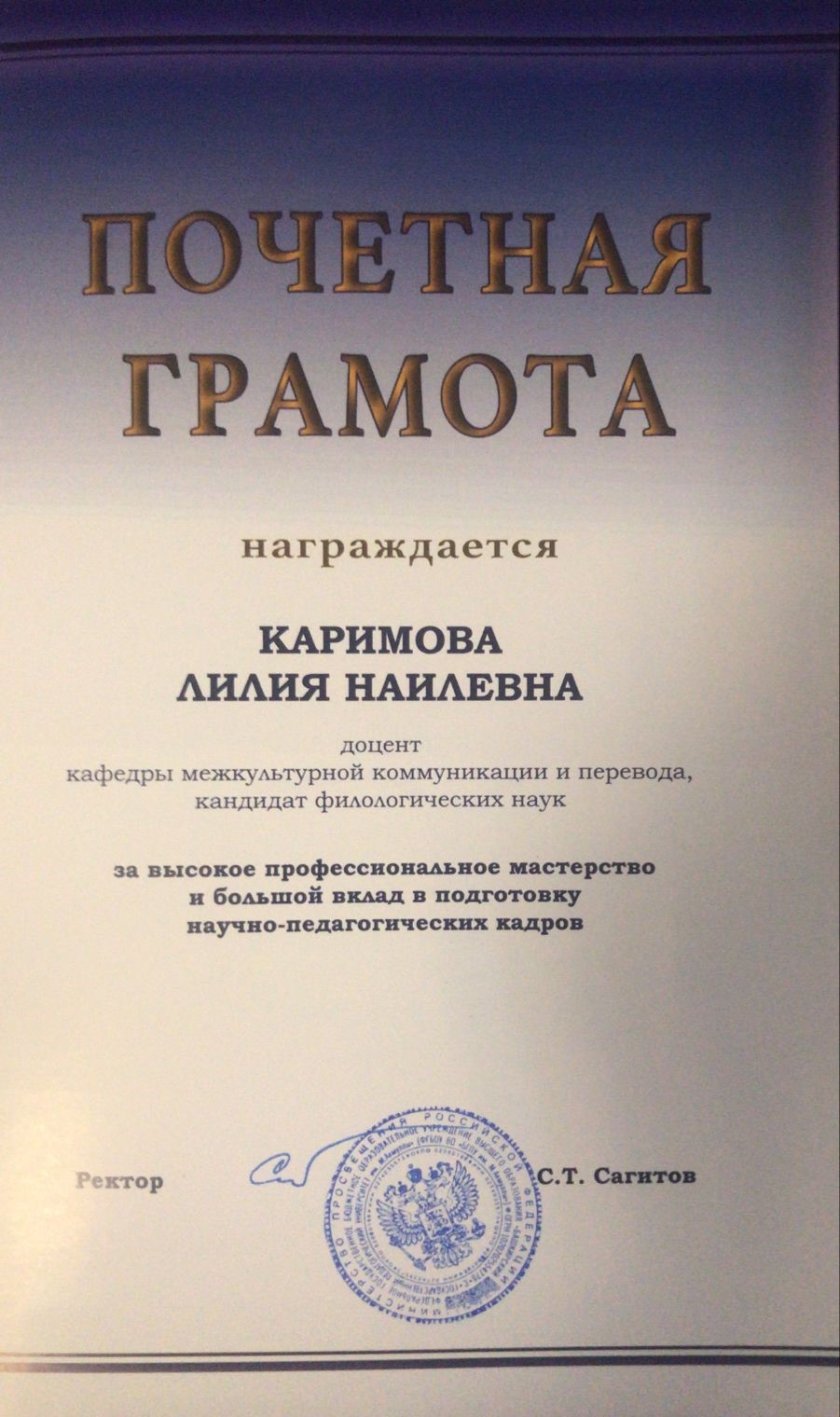Почетной грамотой БГПУ им.М.Акмуллы за высокое профессиональное мастерство и большой вклад в подготовку научно-педагогических кадров награждена к.ф.н., доцент кафедры межкультурной коммуникации и перевода Каримова Лилия Наильевна.