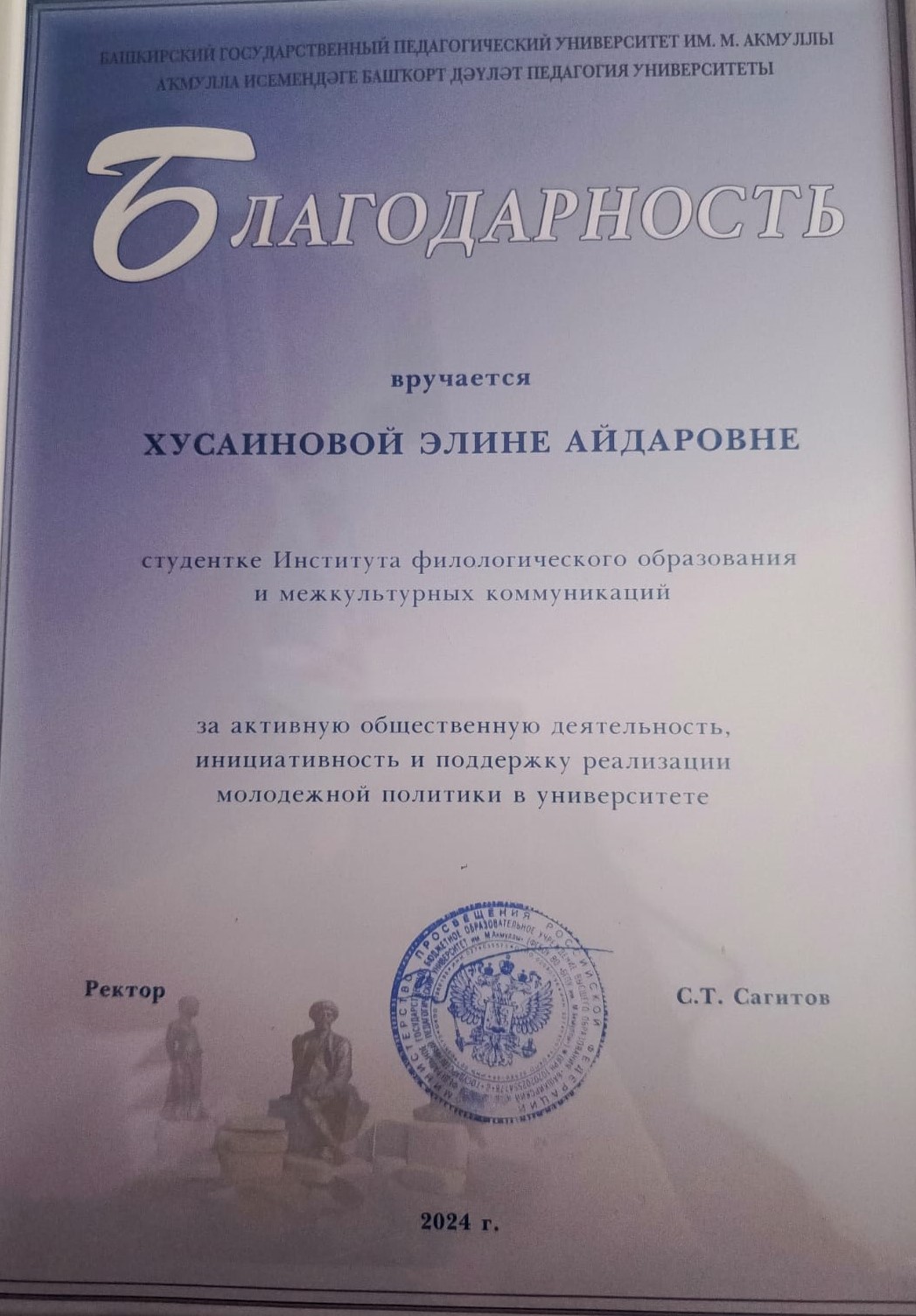 Благодарственным письмом отмечены активная общественная деятельность, инициативность и поддержка реализации молодежной политики в университете студентки группы ЛИНПП-31-22 Хусаиновой Элины.