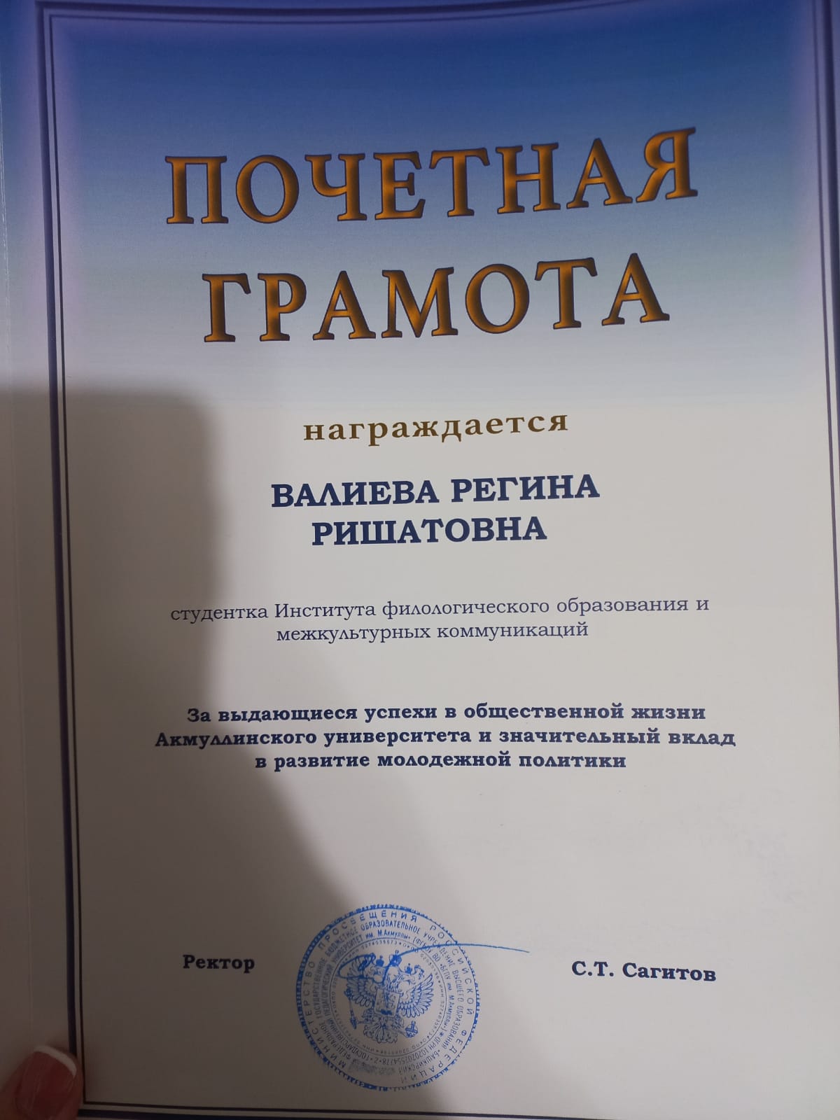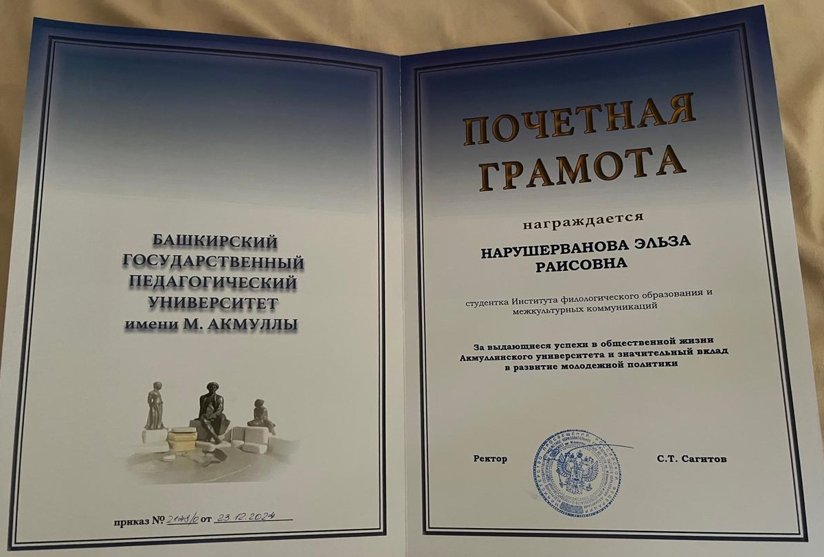 Почетными грамотами БГПУ им.М.Акмуллы за выдающиеся успехи в общественной жизни Акмуллинского университета и значительный вклад в развитие молодежной политики награждены студентки группы ЛИНПП-11-24 Наушерванова Эльза и Валиева Регина.