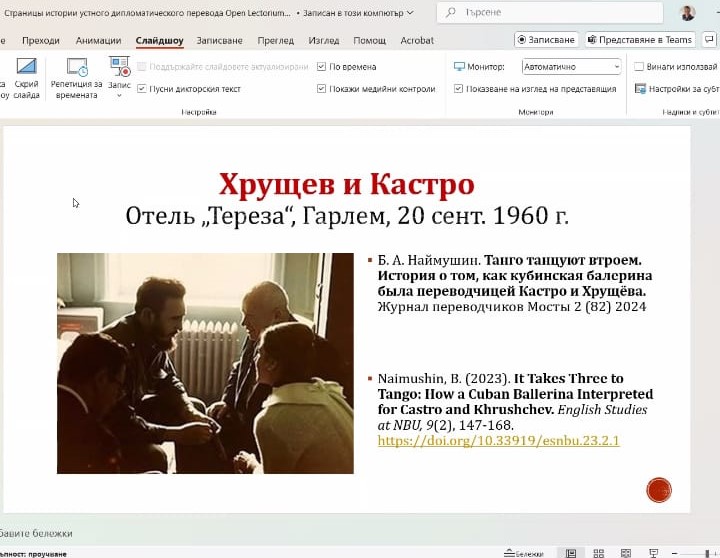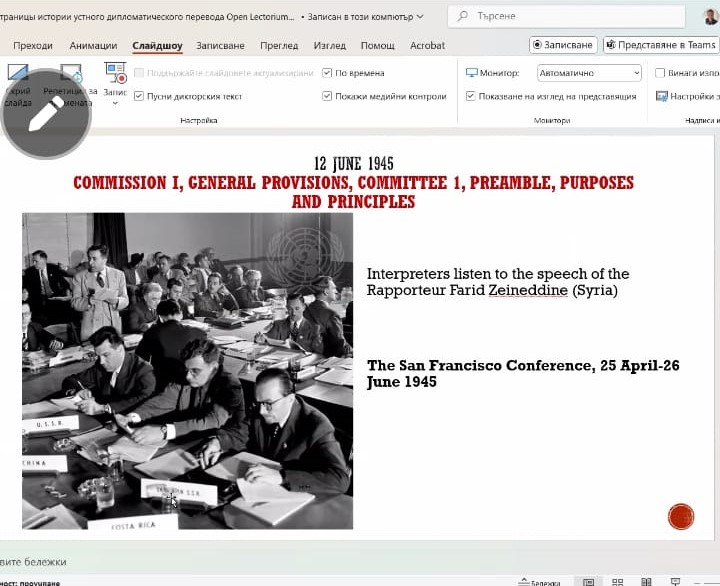 Лектором выступил Борис Анатольевич Наймушин, к.филол.наук, доцент теории и практики перевода кафедры «Иностранные языки и культуры» Нового болгарского университета. Лекция была посвящена вопросам изучения истории дипломатического перевода периода на основе комплексного изучения и сопоставления доступных письменных источников (мемуаров и архивных документов) и фото- и киноматериалов.