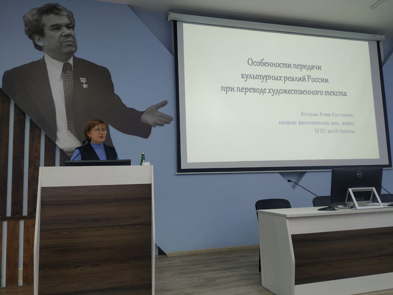 25 сентября 2025 г. в аудитории № 401, учебного корпуса №3. состоялся Республиканский научно-методический семинар «Актуальные проблемы теории, практики и дидактики перевода», посвященный 20-летию кафедры межкультурной коммуникации и перевода. Участниками семинара стали преподаватели, аспиранты, магистранты и студенты направления «Лингвистика». Открыла семинар и.о. зав.кафедрой МКиП, к.филол.н., Юлия Рустэмовна Юсупова, познакомив участников семинара с историей создания кафедры. С приветственным словом к собравшимся выступила директор Института филологического образования и межкультурных коммуникаций, к.пед.н., доцент Халида Халитовна Галимова. Она высоко оценила работу кафедры на протяжении 20 лет и отметила ее достижения. Затем с видеообращением к участникам семинара выступила первая заведующая кафедрой межкультурной коммуникации и перевода, к.филол.н., Луиза Венеровна Газизова, возглавлявшая кафедру в течение 10 лет. Минутой молчания присутствующие почтили память второго заведующего кафедрой – к.пед.н., Олега Александровича Шабанова, руководившего подразделением с 2014 по 2021 год. Также в адрес кафедры прозвучали слова благодарности и теплые поздравления от зав. кафедрой английского языка, к.филол.н., доцента Раисы Мингазитдиновны Иксановой и выпускников разных лет.