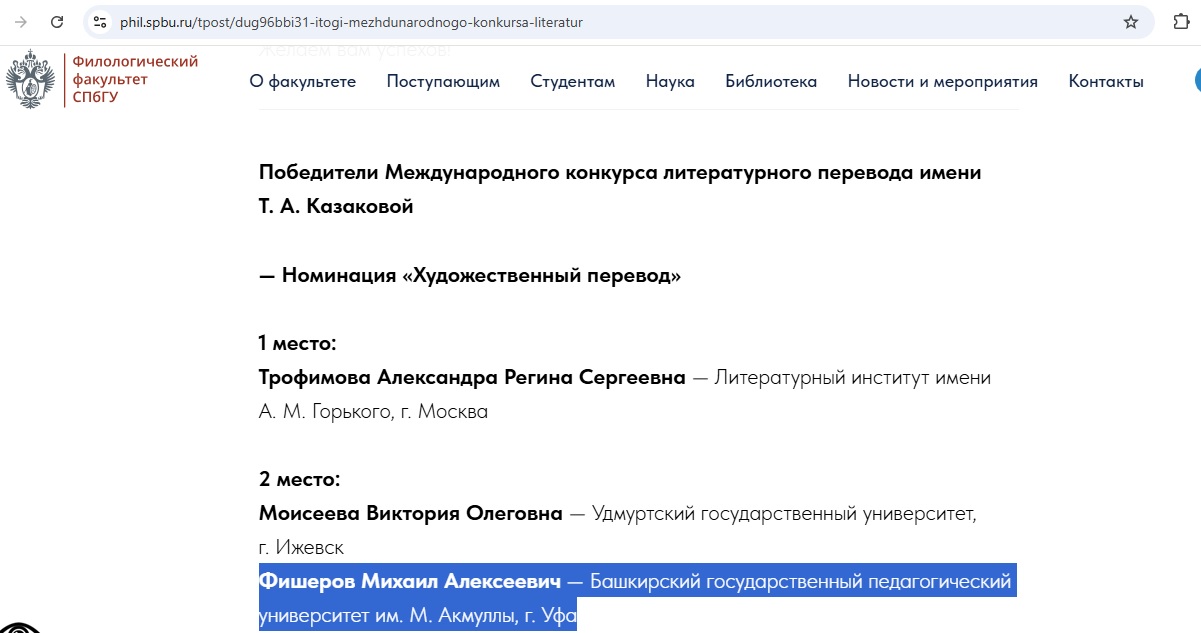 Михаил Фишеров занял 2 место на Международном конкурсе литературного перевода имени Т.А. Казаковой