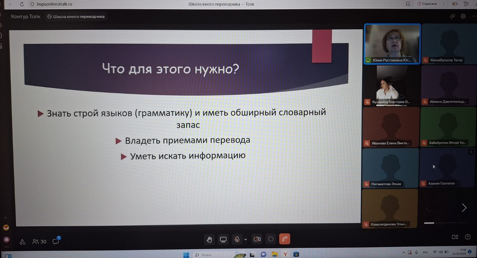 25 октября 2025 г. начались занятия на обучающем курсе «Школа юного переводчика», проводимом в дистанционном формате кафедрой межкультурной коммуникации и перевода Башкирского государственного педагогического университета им. М. Акмуллы для учащихся 10-11 классов общеобразовательных учреждений РФ. Школьники получили уникальную возможность погрузиться в мир перевода под руководством ведущих преподавателей и переводчиков нашего университета, что позволит им сориентироваться в выборе будущей профессии.